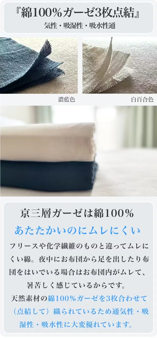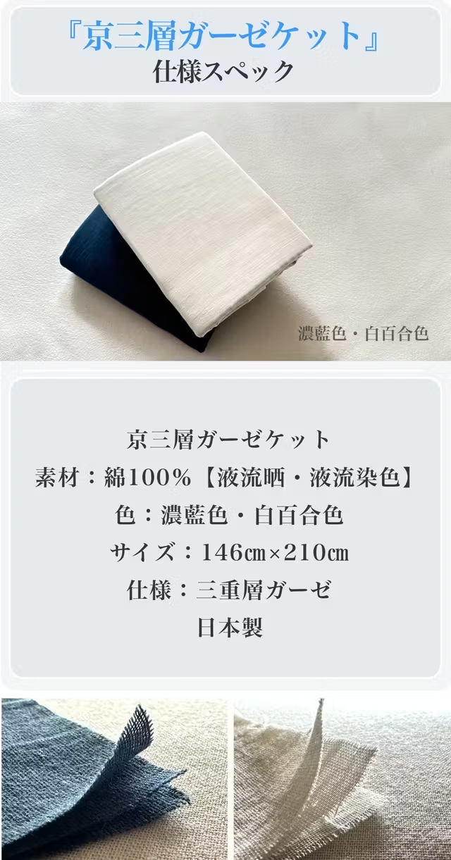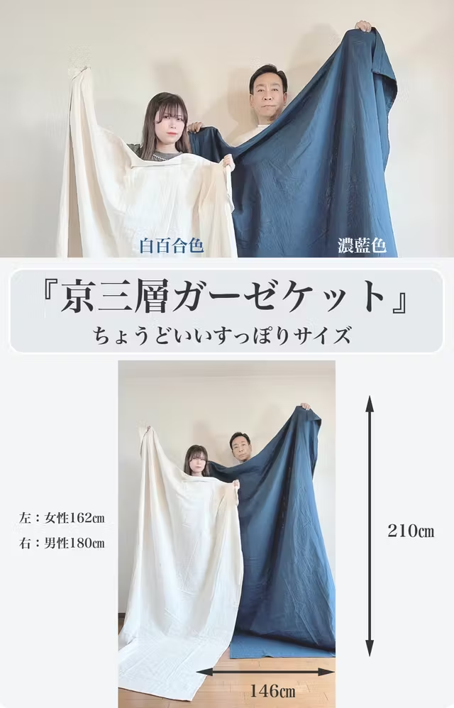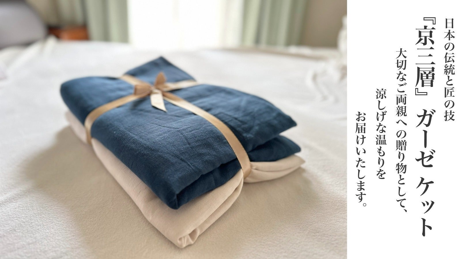 乾燥や冷気から守る!さっぱりとした優しい肌触りは真夏の贅沢な『京三層ガーゼケット』です。