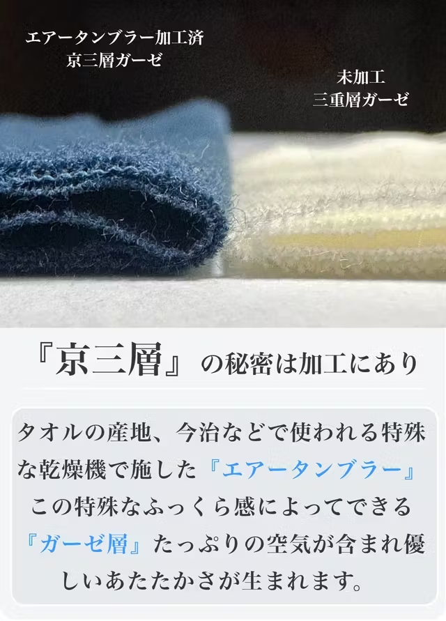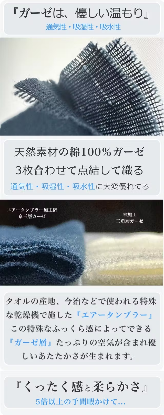 でも、あったかいだけじゃ寝汗を掻くし、布団を剥いでしまうし寝苦しい。また寝冷えしてしまうんです。でも『京三層ガーゼケット』は通常のガーゼより1.5倍ふっくらしているので寝汗を吸収しやすく、速乾性もいいからさっぱりしているんです。