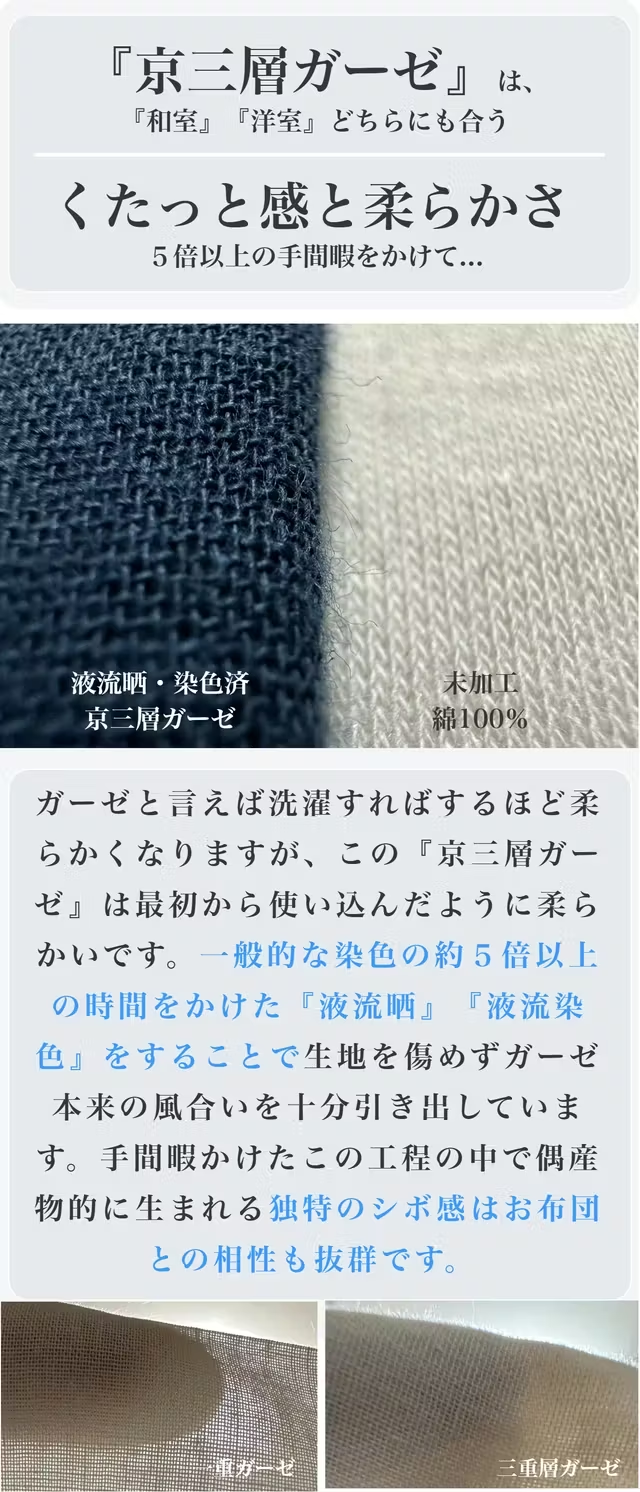 『京三層ガーゼケット』は、ただ3枚重ねたガーゼケットではありません。1.5倍の膨らみを出すために、5倍の手間暇をかけて仕上げた、ワンランク上のガーゼケットです。液流晒という日本の伝統を受け継がれた染め技術で作られた色合いは、風合いがやわらかく、一年を通じ使えるものです。真夏の冷房対策や、寝汗で悩んでいる方にもおすすめです。