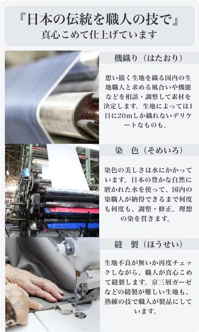 2024/06/28 08:56CAMPFIRE支援者の皆様おはようございます。『京三層ガーゼケット』超高級ガーゼで熱中症対策、寝冷え対策を!企画まもなく(残り2日)終了です。当店は素材にこだわり、一般流通ではなかなか手に入らない上質な製品開発をしています。肌触り、国内繊維、国内生産にこだわり、熟練職人が一枚一枚を仕上げています。安価な製品を大量生産しているわけではございませんので価格はご了承ください。ただし、クラファン限定価格でご提供しています。日本製の安心された商品を是非、この機会にご堪能くださいませ。 もっと見る