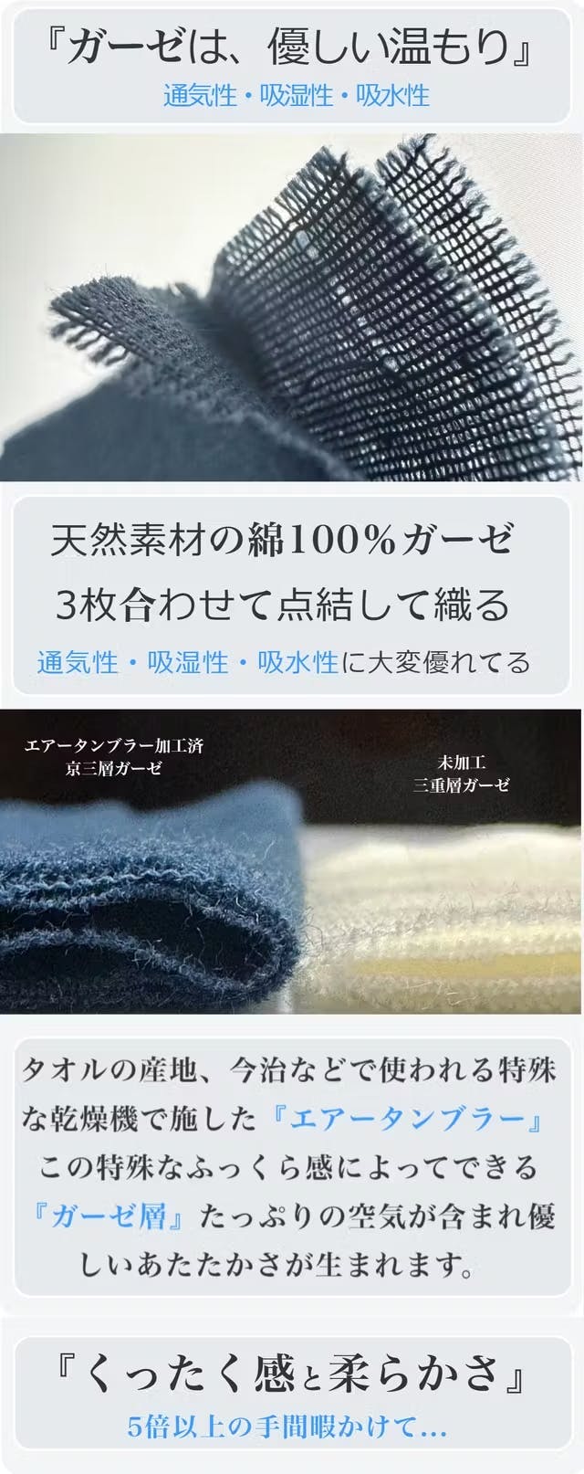 3枚の上質なガーゼは『綿糸1本1本がふっわりと練り』あげ。そして空気を包み込むように織り上げていますのでとにかく軽い!そしてこだわりの工程がちょうどいい保温性と吸水性を生み出し真夏の睡眠環境をさらに快適な環境にしてくれます。