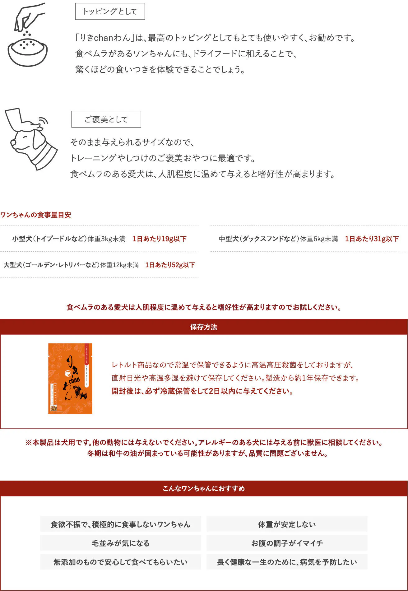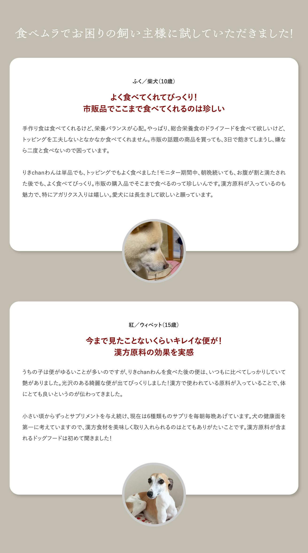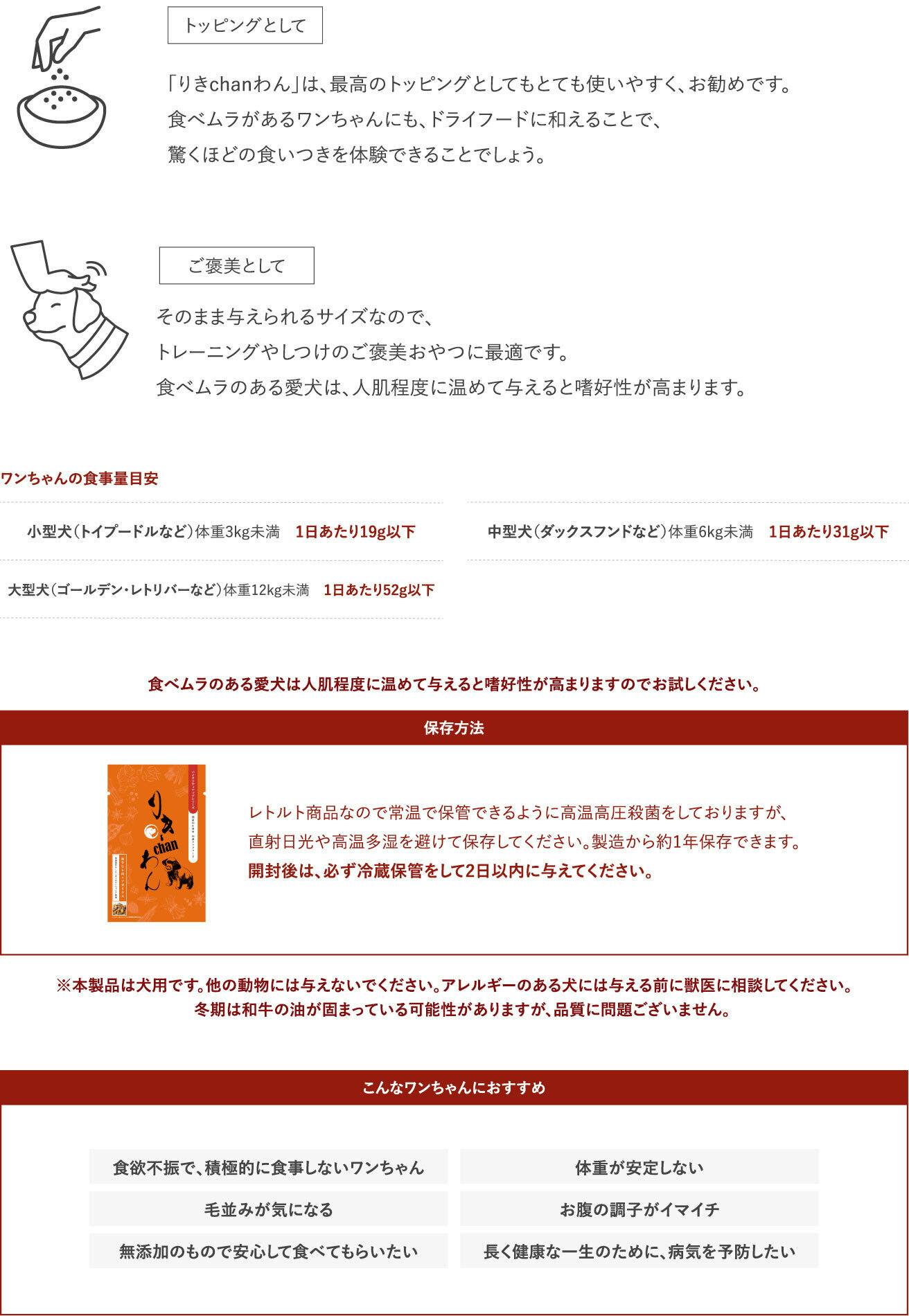 「りきchanわん」は、愛犬への特別なご褒美です。主食としてではなく、トッピングやおやつとして、毎日の食事をより楽しく、美味しくするお供に最適です。愛犬が喜ぶこと間違いなしの「りきchanわん」で、特別なひとときをお楽しみください。