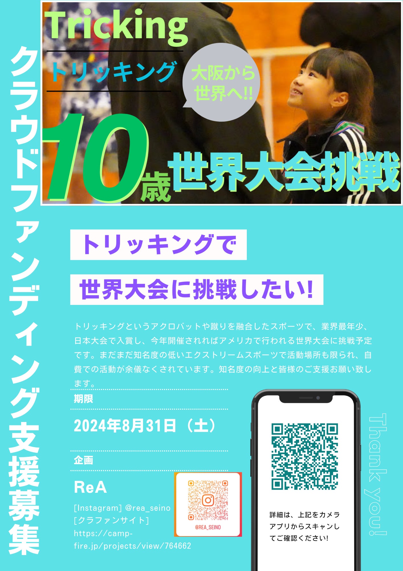 ご支援頂きました皆様へご支援ありがとうございます。先日ご報告させて頂きましたアメリカ世界に引き続き,イギリス世界大会も決定致しましたのでご報告させて頂きます。クラウドファンディング に引き続き,SNSでの応援やご支援,実際にお声掛け下さったり,感謝申し上げます。皆様から頂きました応援やご支援は,蓮愛の励みになります。ありがたく世界大会に挑ませて頂きます。ありがとうございます。Wighttricks academy ReA instagram 大会経歴VoLatricks '25 U-15 優勝VoLatricks×inherit V '24 OPEN 3位TBQ '24 U-12 優勝(全日本トリッキング大会)XTC '24 Female 優勝XTC '24 U-15 2位極限武術 '24 Female 2位