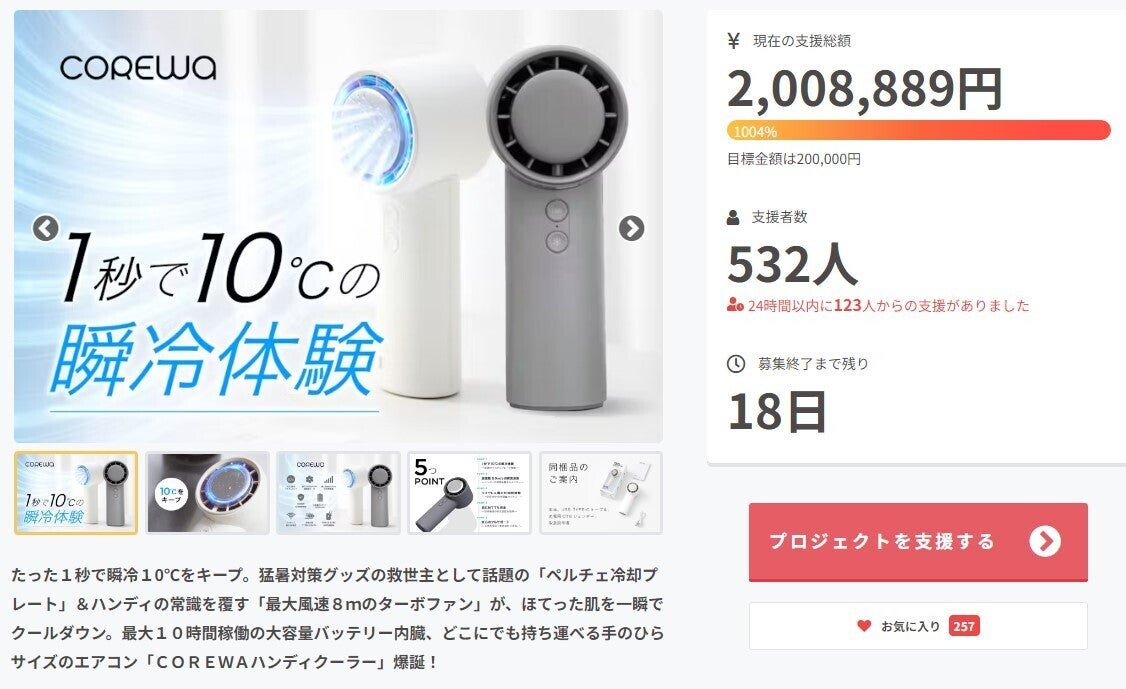 サポーターの皆様。こんばんは!COREWAハンディクーラープロジェクト実行者、ハートグローバルマーケティングです。引き続きのご支援のおかげで本プロジェクトがご支援総額3000%を突破することができました。たくさんのご支援いただきまして誠にありがとうございます。現在プロジェクトリターン製品についての進捗状況についてご報告いたします。1.リターン製品は6月18日から量産スケジュールを確定し、製品の部品調達とパッケージ量産を開始しております。総生産数量は2500台になり、余分の在庫も確保しております。2.現在の量産スケジュール上では7月中お届けには問題なく進めております。できる限り早くお届けできるように生産工場と日々協議を行っております。3.現段階で製品の国内発送はヤマト運輸でお届けする予定です。プロジェクト終了後も以下の販売店で展開する予定です。【予定オンライン販売先】アマゾン、楽天市場【予定オフライン販売先】モリモリストア(秋葉原駅前店、新宿西口店)、蔦谷家電(二子玉川店)、LOFT(渋谷店)サポーターの皆様が弊社製品で少しでも快適にこの夏を過ごせるように、引き続きベストを尽くします。プロジェクト終了まで残り6日です!何卒引き続きの応援と今回のプロジェクトのSNS拡散のご協力をどうぞよろしくお願い致します!