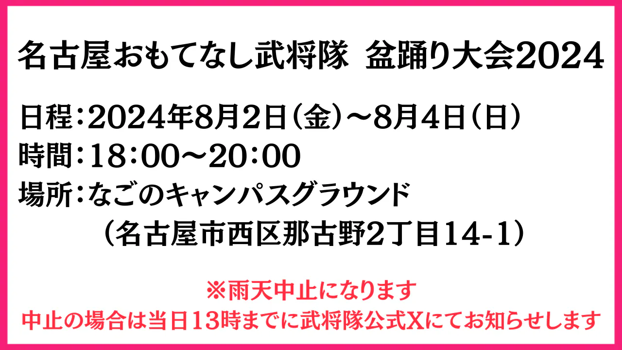 今年も3日間開催である、既に参陣経験ある者はあの熱狂を今再び、そして初陣の者も、我らの盆踊り大会を体感して欲しい、楽しめる事間違い無し
