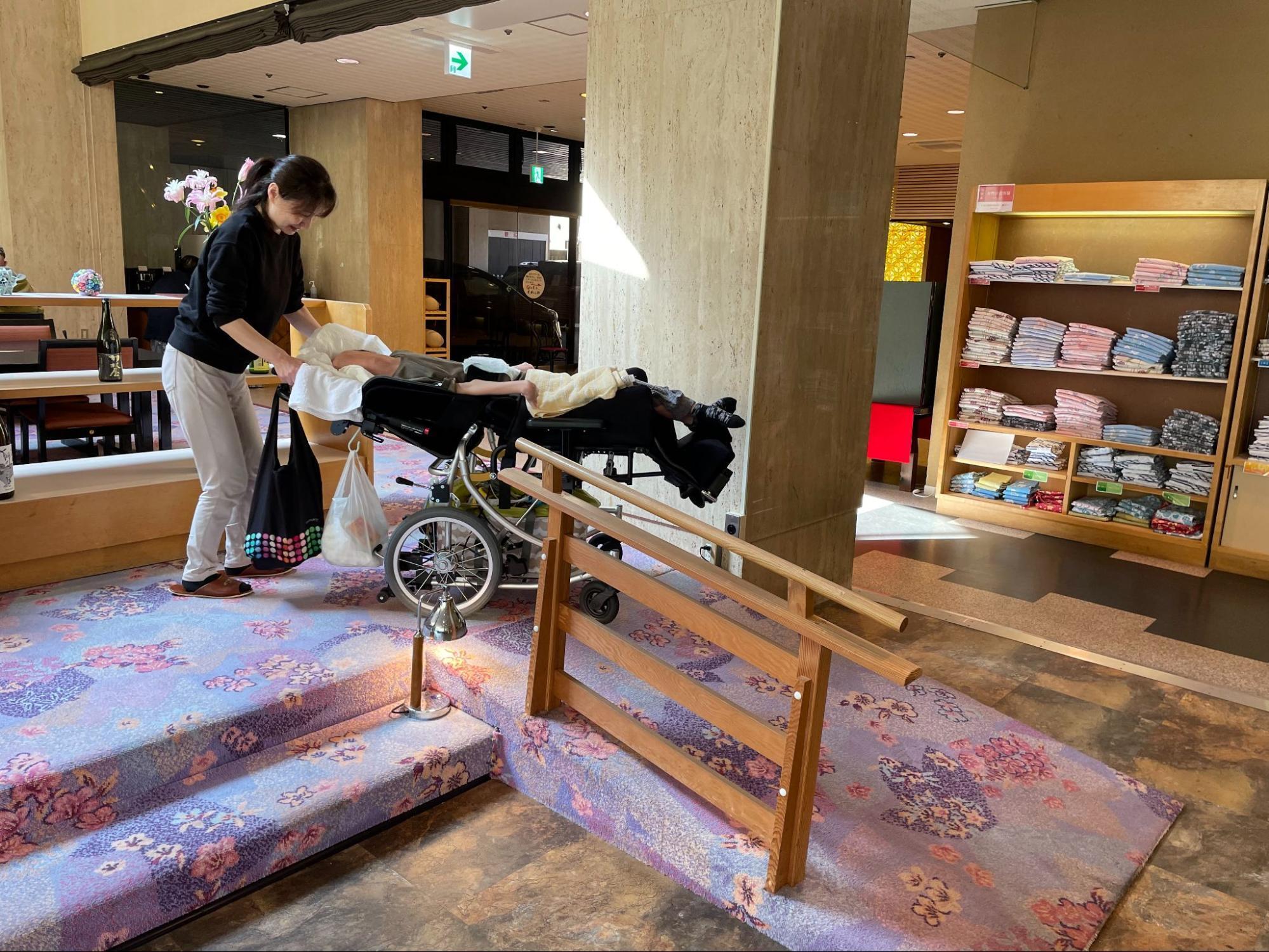旅行支援の1シーンより。大きなストレッチャー型車いすでは、転回するのも大変です。