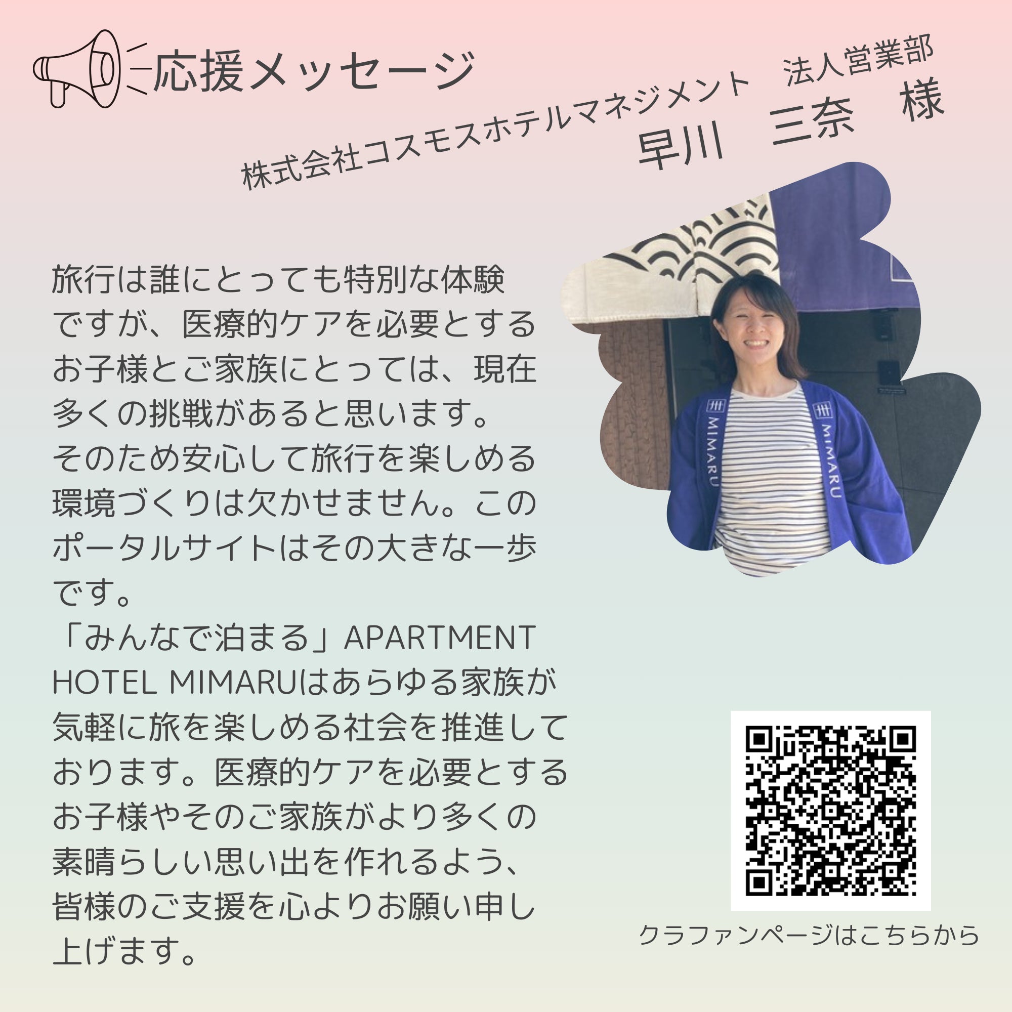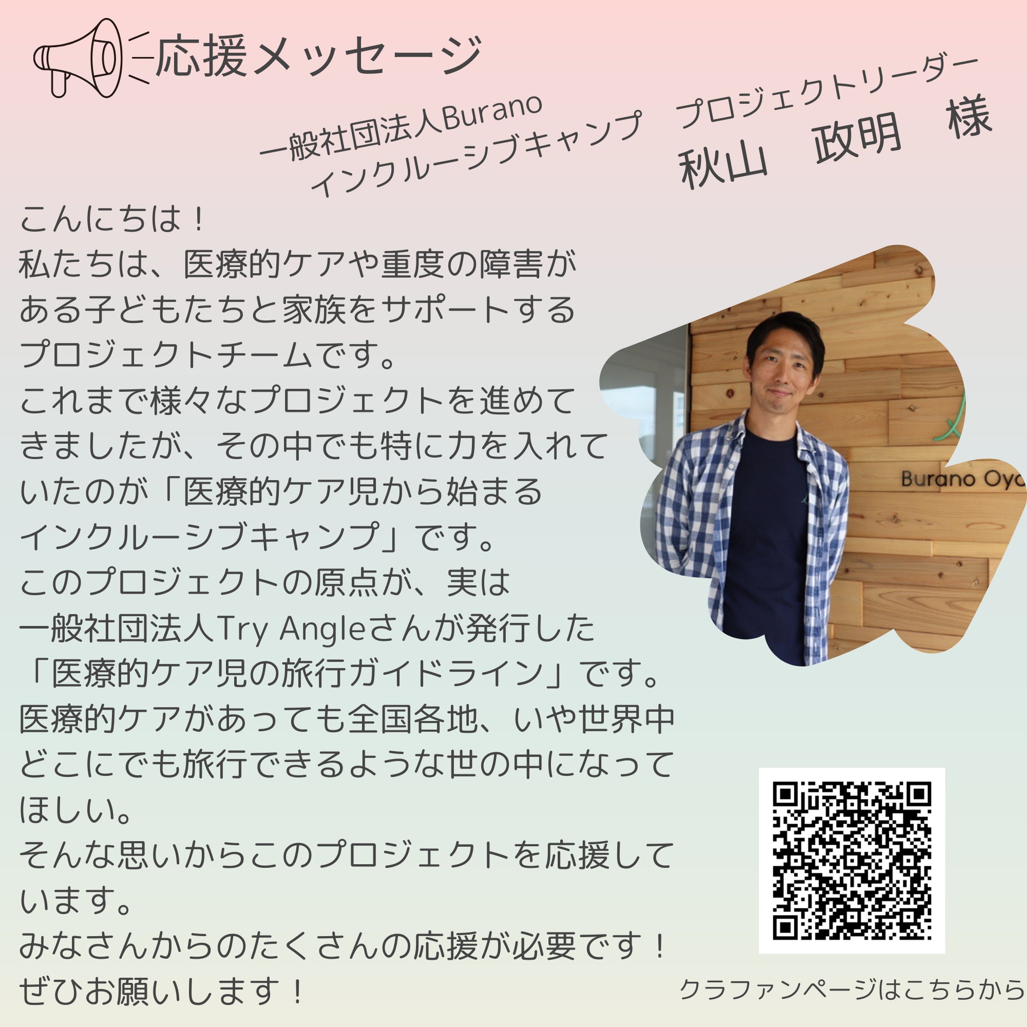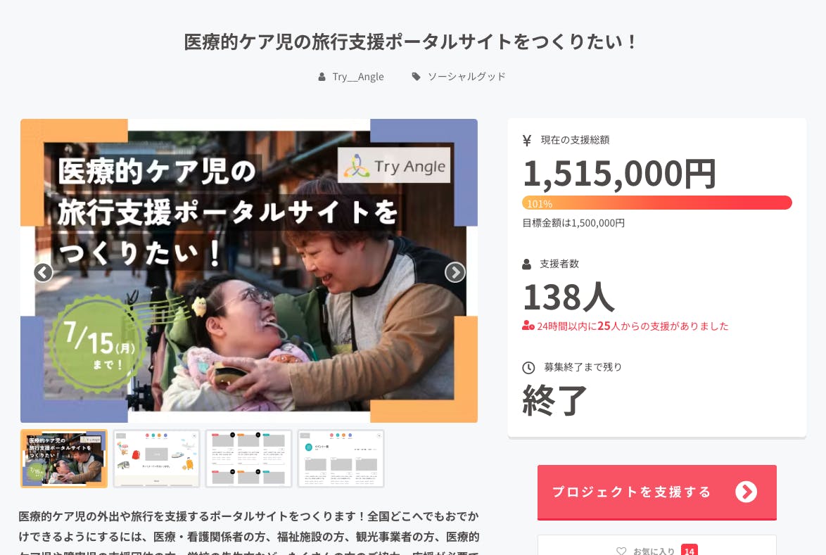 Try Angleだけでは難しいことも、全国の医療的ケア児の旅行や外出を応援したいお気持ちを持った方々と一緒ならできると思っています。ぜひ応援をお願いします!