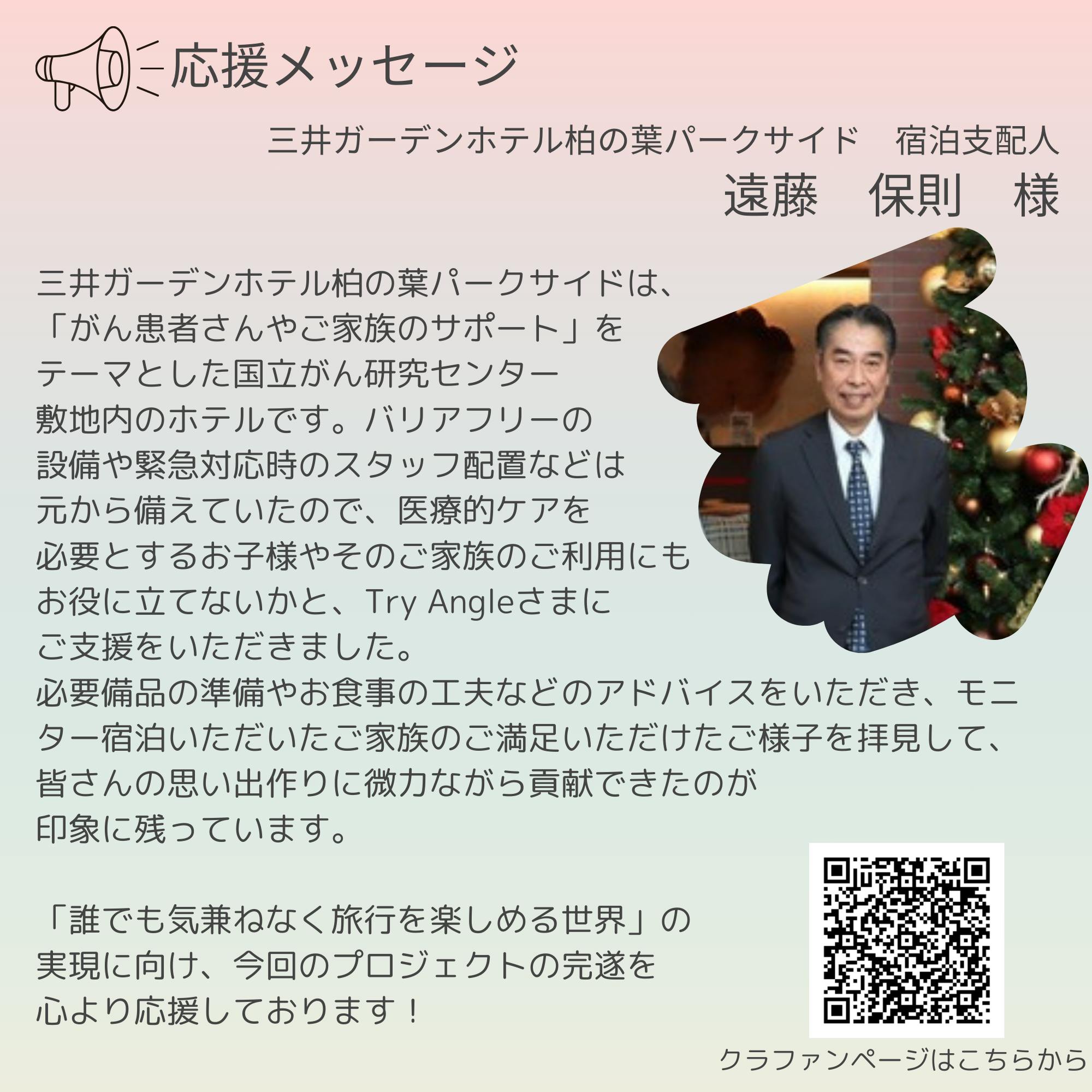 「誰でも気兼ねなく旅行を楽しめる世界」の実現に向け、今回のプロジェクトの完遂を心より応援しております!