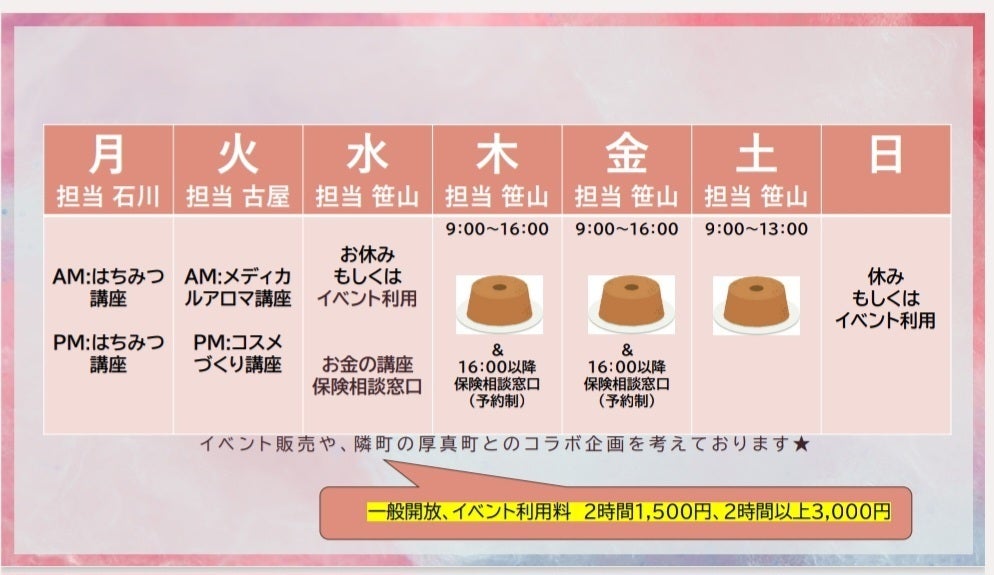また、曜日ごとに講座やイベントの開催も企画しており、安平町の新しい居場所として町内の人々で賑わう場所にしていきたいと考えています。