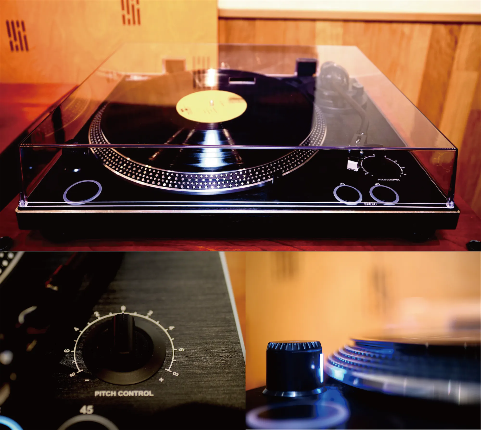 ピッチコントロール可能。正しいピッチ調整は青色LED ストロボとターンテーブル上のストロボドットで行います。
