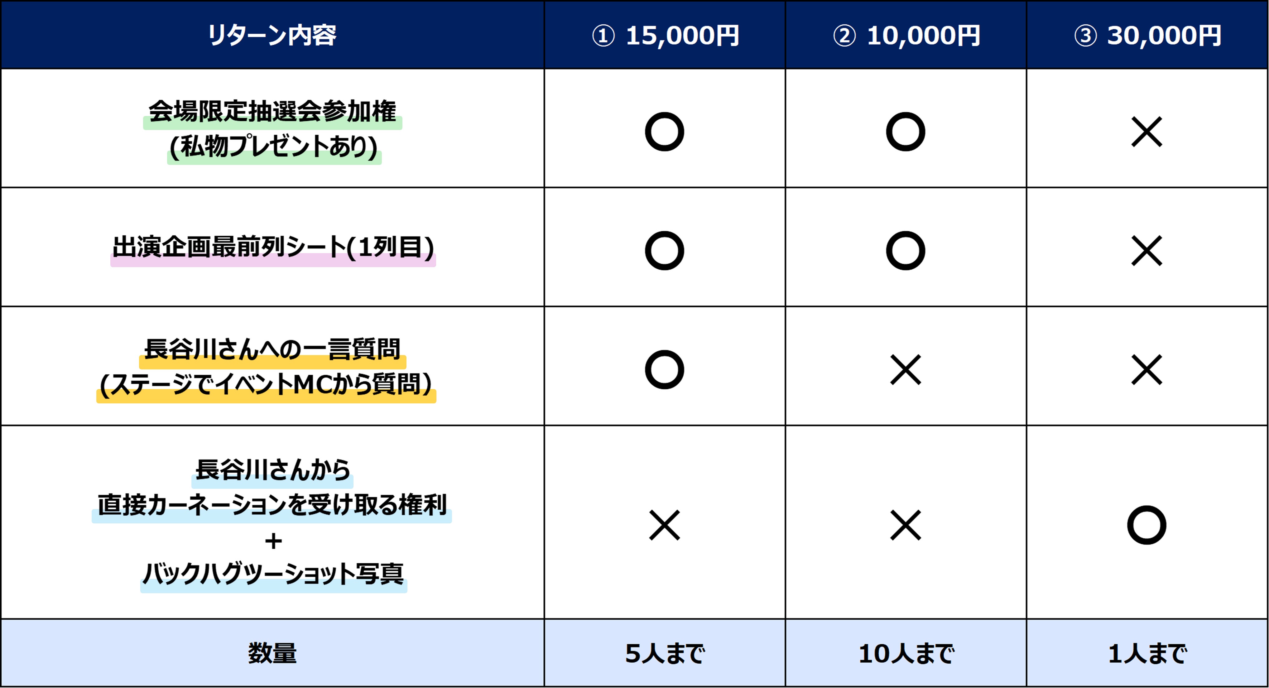 この特別なリターンでは、長谷川さんから1輪のカーネーションを直接受け取り、バックハグツーショット写真を撮ることができます。