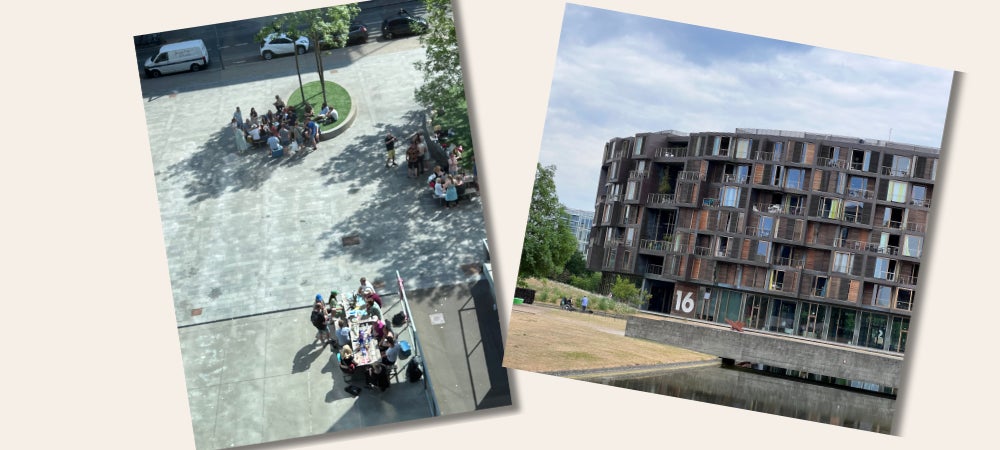 (写真:広場で集う人々とIT University of Copenhagen学生寮)