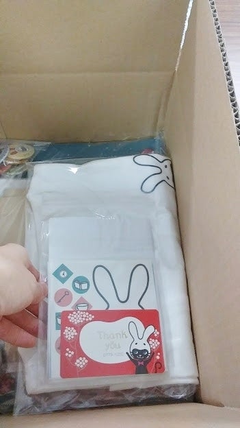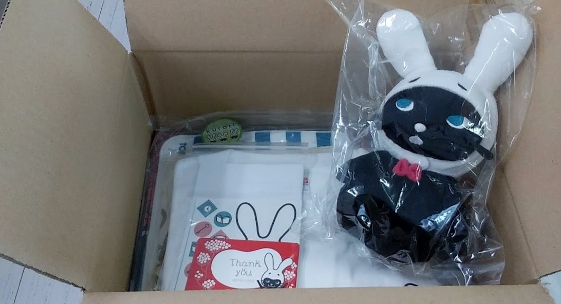 そして、あらかじめ用意しておいた封入物を箱詰めしていきます。1万円コースにはくらりグッズ、くらりTシャツ、「くらり」ぬいぐるみ、サンクスカードを梱包しています。