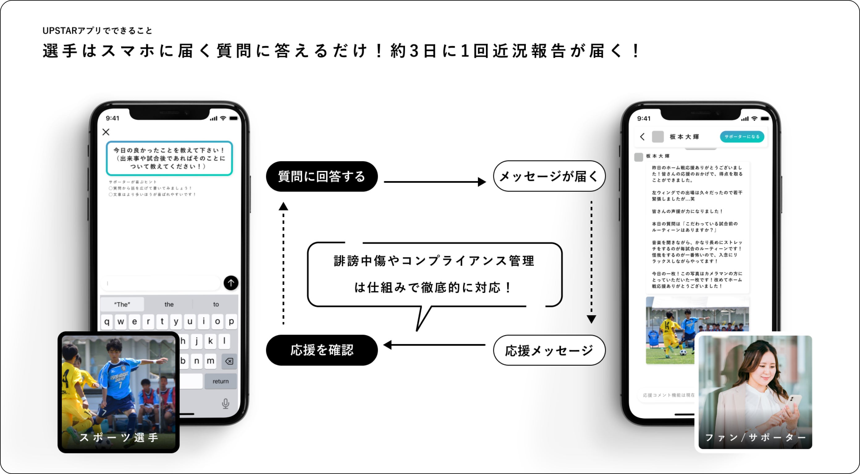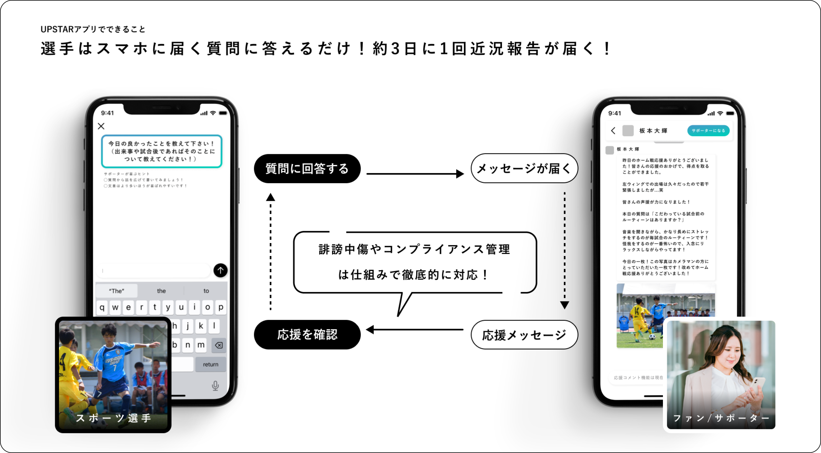 UPSTAR(アップスター)は、現役スポーツ選手(プロからアマチュアまで)とファン・サポーターを繋げるファンコミュニティスマホアプリです。