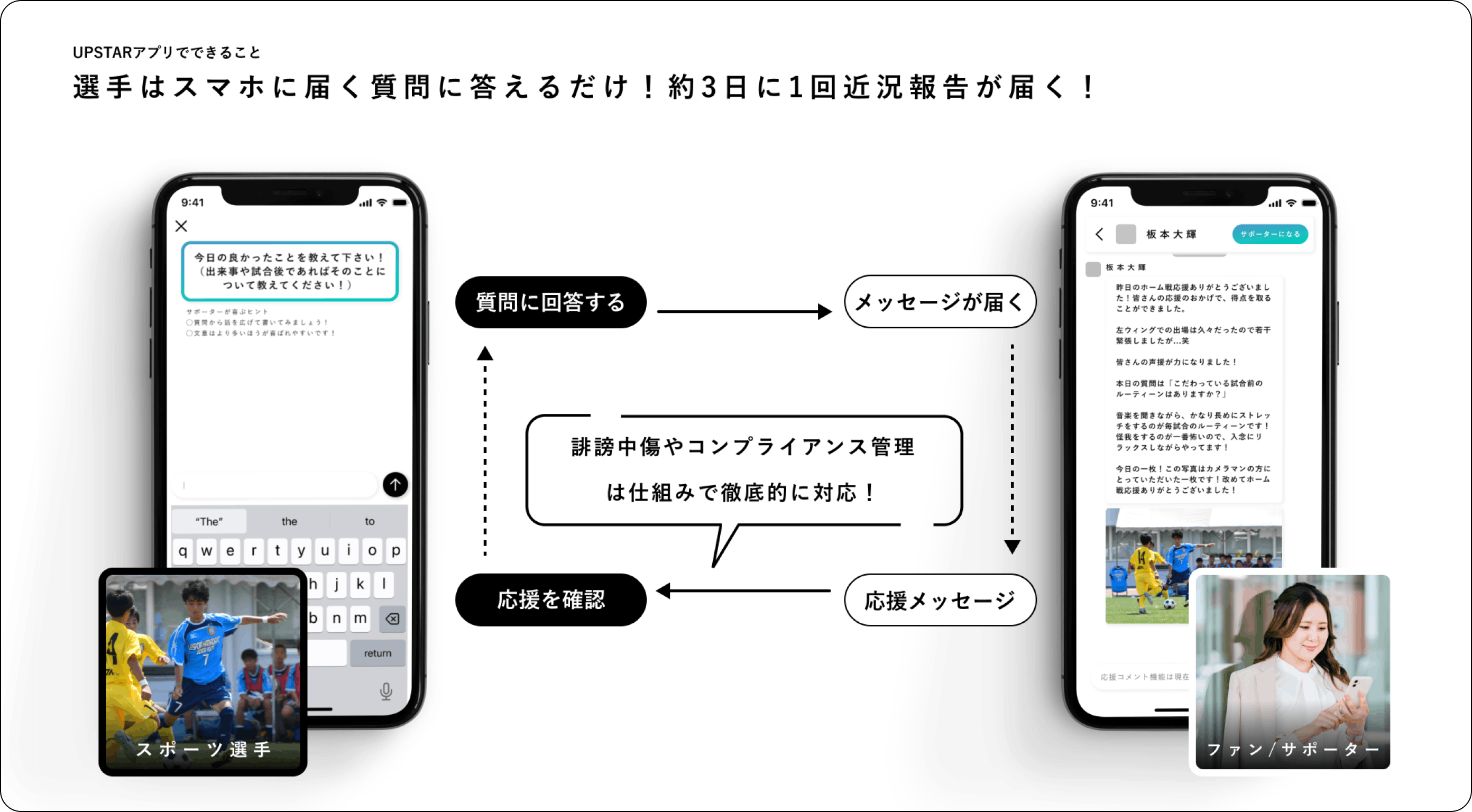 まず、選手それぞれに、研究された弊社独自の「価値観や内面を深掘りする質問」に答えていただきます。そしてその回答からメッセージを作成し、サポーターのもとへお届けします。サポーターは、選手の調子の良い時だけではなく、うまくいかない時の葛藤や悩みも含めて、およそ3日に1回の頻度で近況を知ることができます。