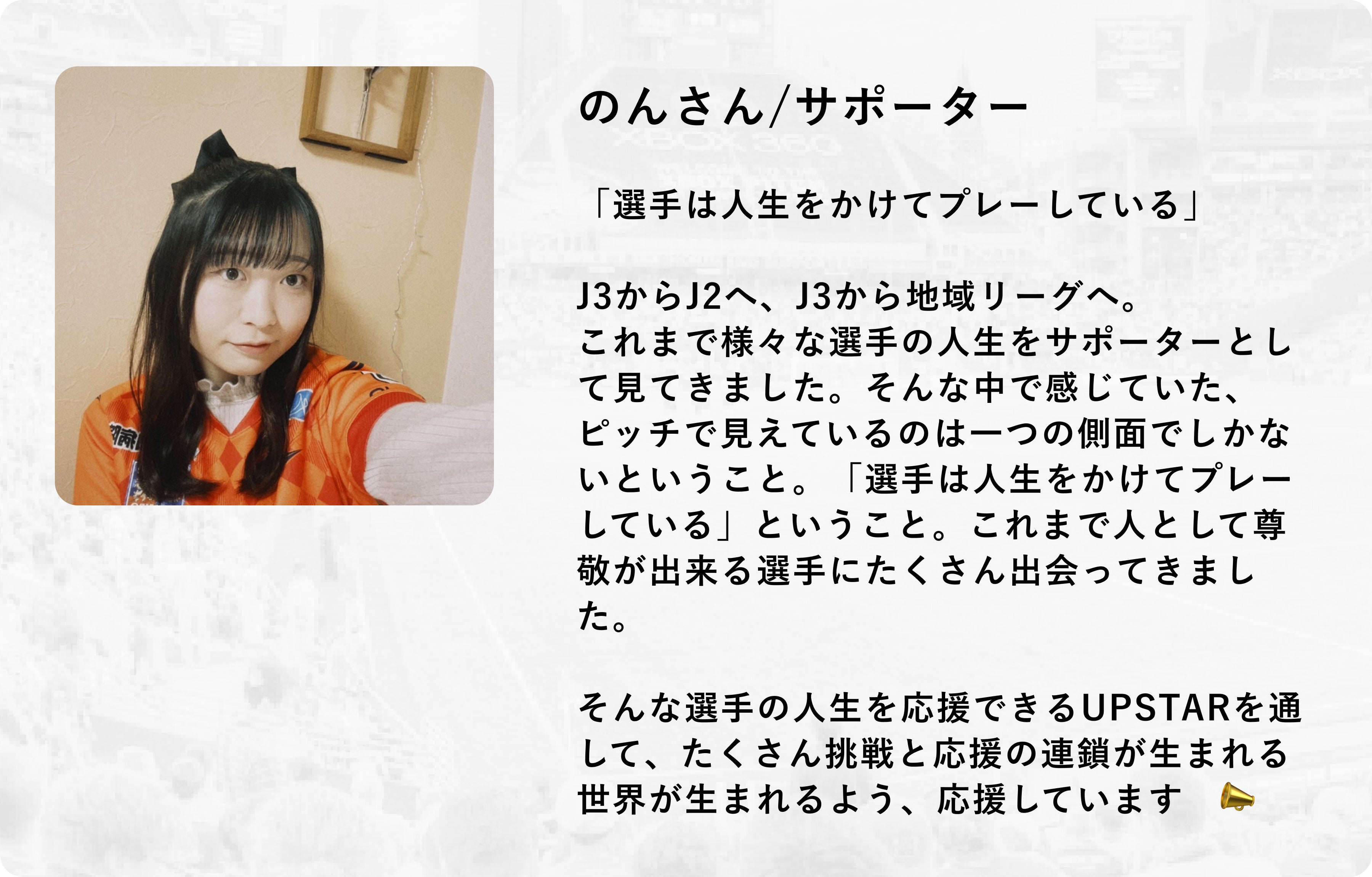 そして立ち上げたのが、「UPSTAR」です。サポーターは、選手一人ひとりが順調に成長していく姿やなかなかうまくいかず葛藤している様子、意外な一面も含めてオープンに知ることができます。そして、より近い距離感でより深く応援できることで、サポーター自身が勇気をもらえたり、お互いがお互いの励みとなれる関係を築けるようなコミュニティをつくりあげたいと思いました。それが、私が目指す “挑戦と応援の連鎖が生まれる世界” です。