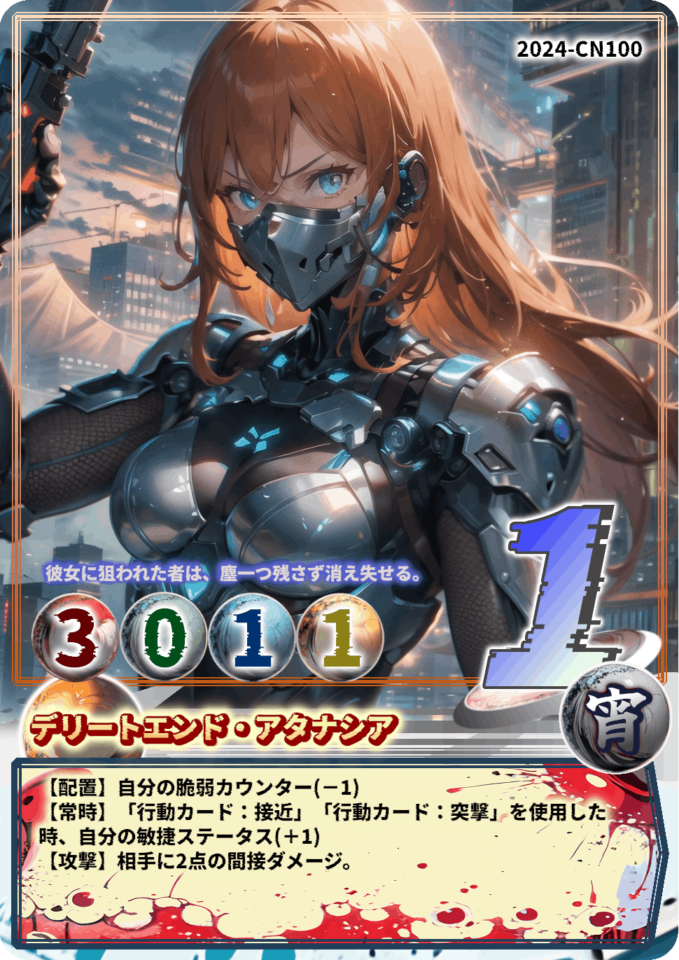自分のプレイヤーマットに脆弱カウンターと呼ばれるキューブが置かれる時がありますが、これを配置したタイミングで1個除去できます。また、唯一無二の特殊性能としてバトル時に特定の行動カードを使用した時に、敏捷ステータスが1上昇するバフ効果が得られます。「接近」は最初から所持しており、効果の発動は容易ですので、敏捷ステータスバフを受けやすいデザインにしております。また、テストプレイ時で強いとされていた仲間カード「メカックス・ジェッタ」と同様の「相手に2点の間接ダメージ」がつく事で、まさにデリートエンドしそうな超クールなカードが誕生いたしました。