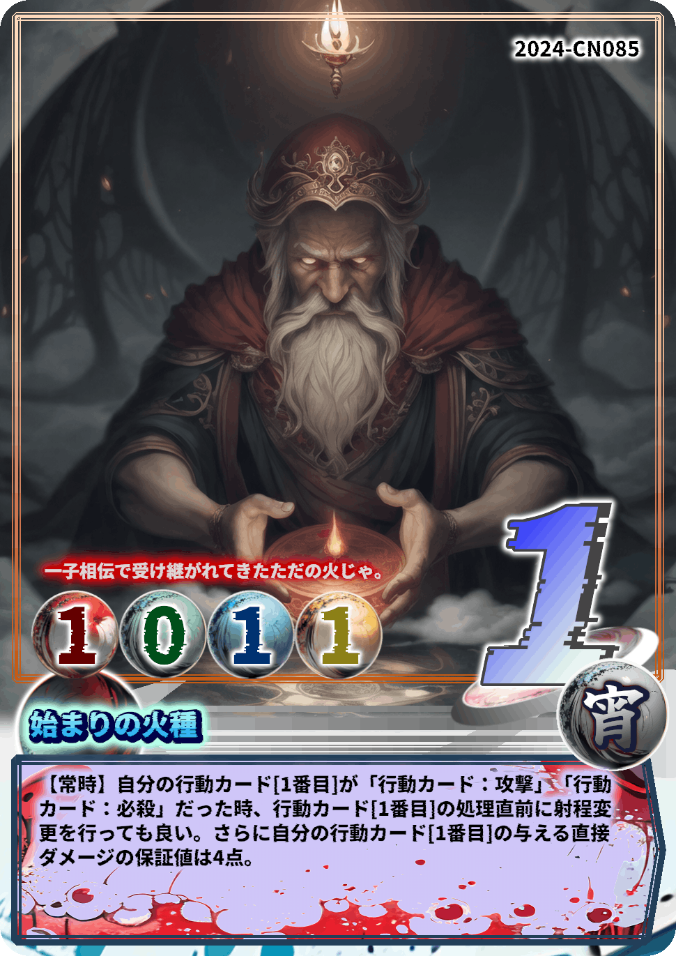 今回ご紹介する始まりの火種は簡単に言えば「行動カード1番目に攻撃とか必殺とかぶちこんだら、当てやすいしめっちゃ強いっスよ」っていうカードになります。ただ他のプレイヤーに「へへっ、どうせ君は行動カード1番目は攻撃か必殺なんでしょ、こっちは移動しちゃうもんね」と普通のカードゲームならそれで終わりそうなカードですが、このカードは「行動カード1番目に攻撃か必殺を選択した場合は、この処理直前に射程変更ができる」というとんでもない効果を有しており「絶対攻撃必殺1回だけ当てるマン」的なカードになっております。当てる事で直接ダメージの保証値は通常「1」に対し、このカードは「4」に一時的に変化しますので結構なダメージソースとして機能します。ただここまで露骨なカードを使用すると相手は「行動カード:防御」を持っていたら確実に「防御」してくるのでこの辺が面白ポイントの駆け引き要素になります。次回は「行動カード:防御」のご紹介をします!