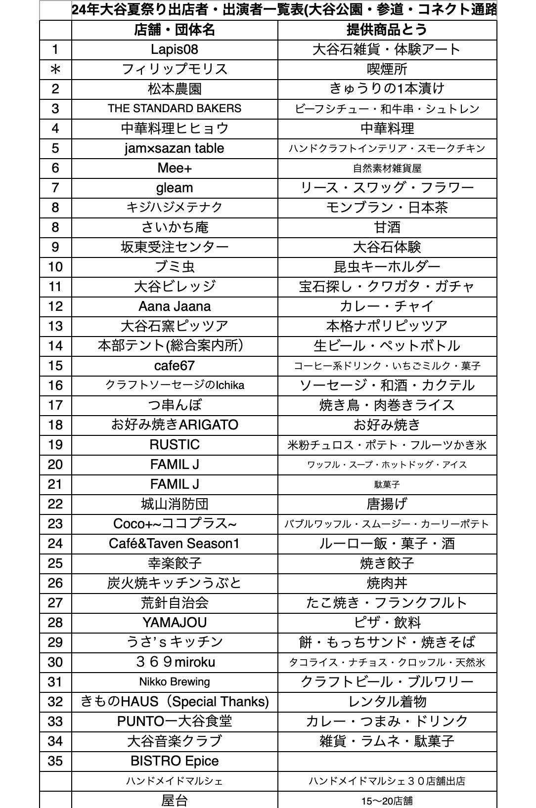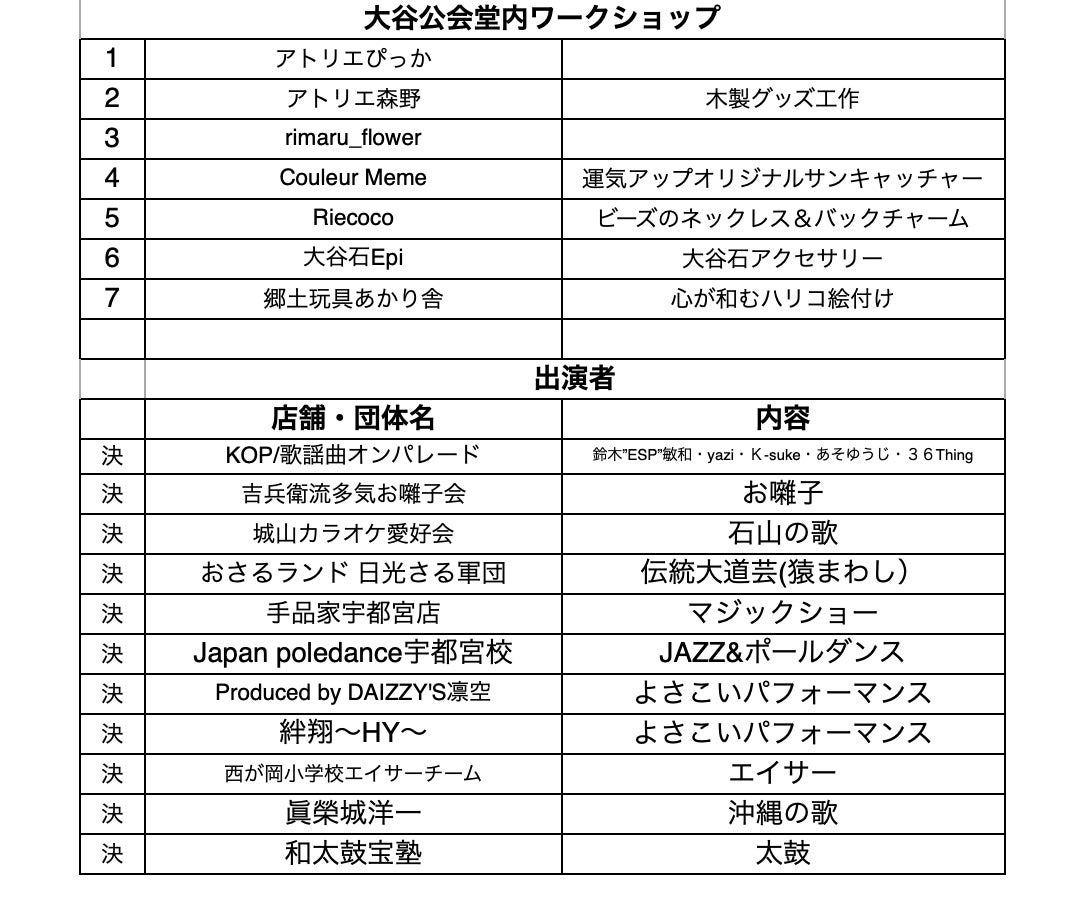 現状、『大谷夏祭り』の実施に向けて以下の出演者、出店者、そして今年度より新たな試みとして、昨年オープンしたばかりの「大谷コネクト」に大谷石の加工やアクセサリー制作などの、夏休みの宿題にもなっちゃうワークショップをお呼びしております。