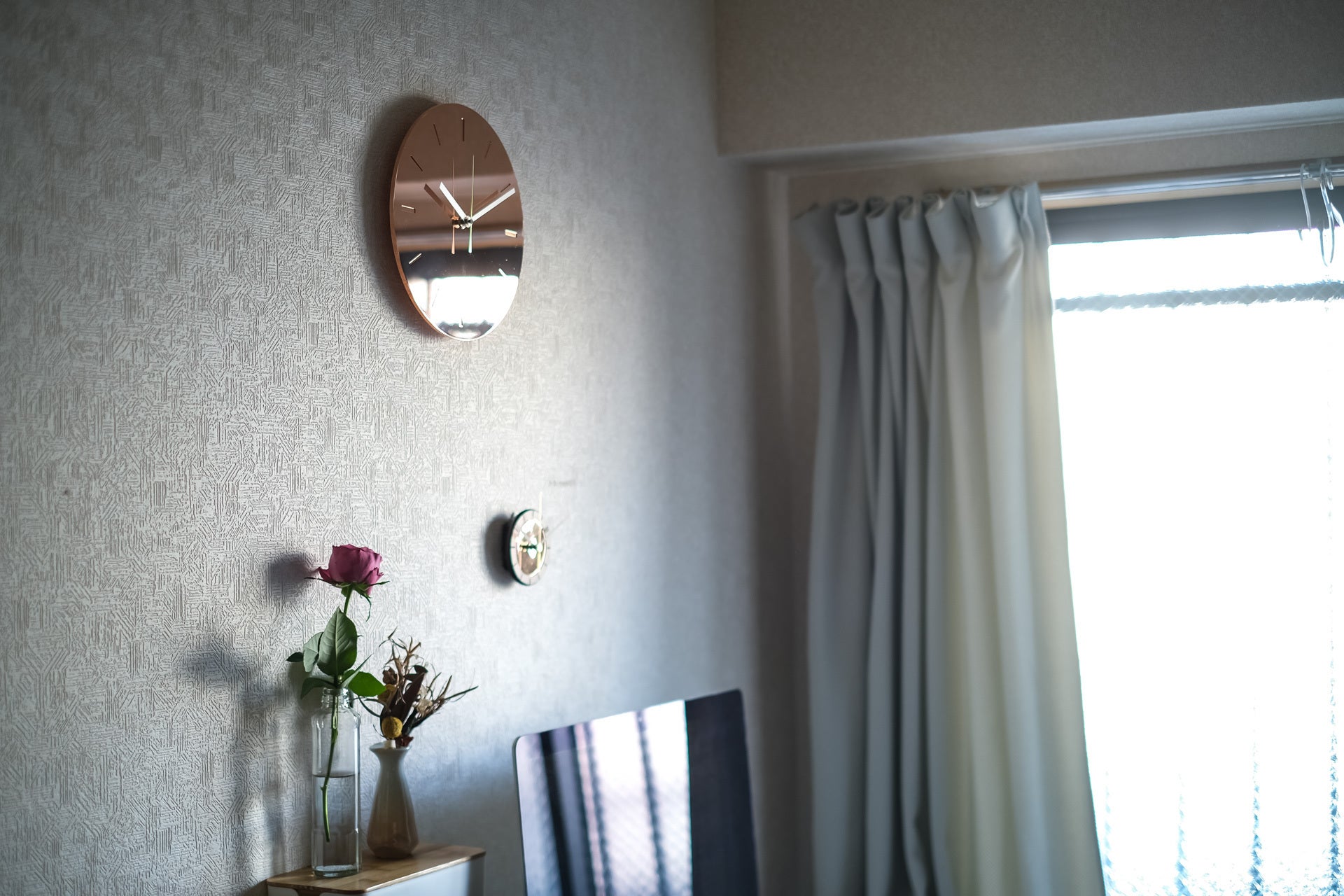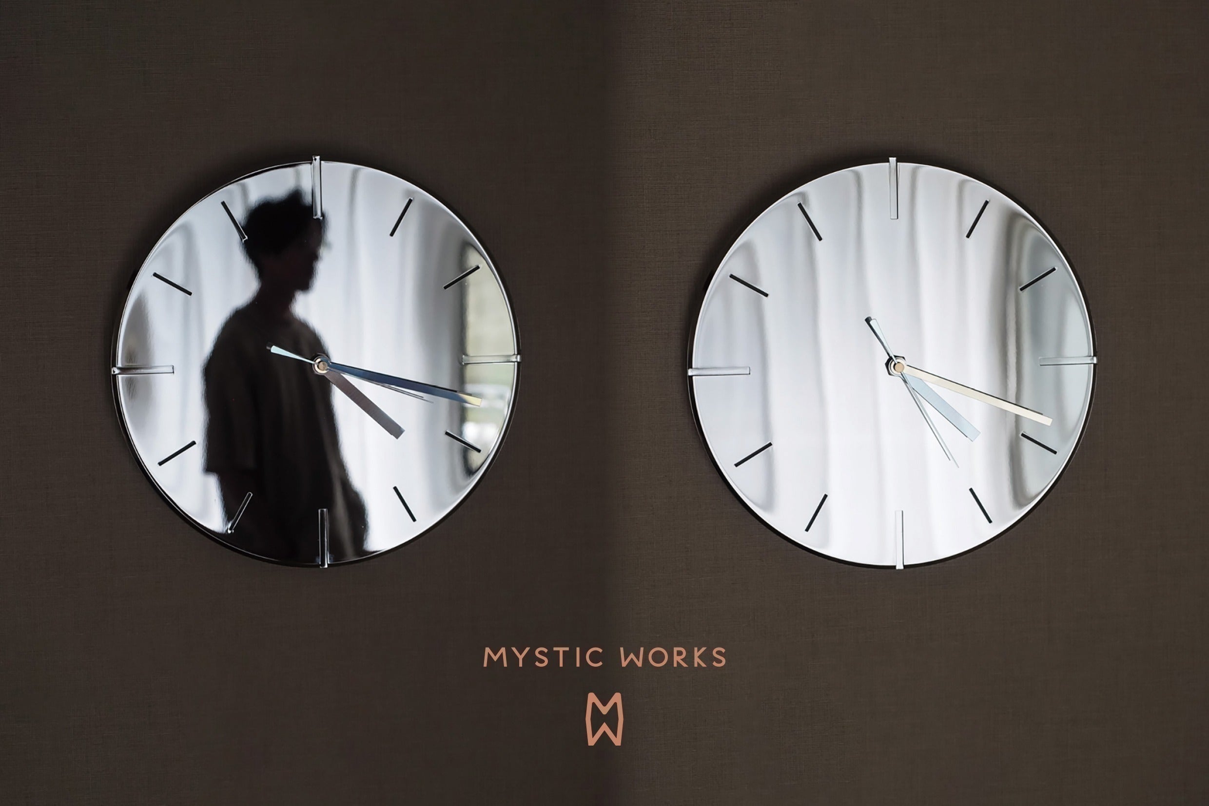 鏡面反射仕上げの時計はひかりを反射して輝き、拡散するので朝、昼、夜と差し込むひかりによって雰囲気を一変し針を読むというよりも感覚的に時間の変化を楽しむことが可能です。