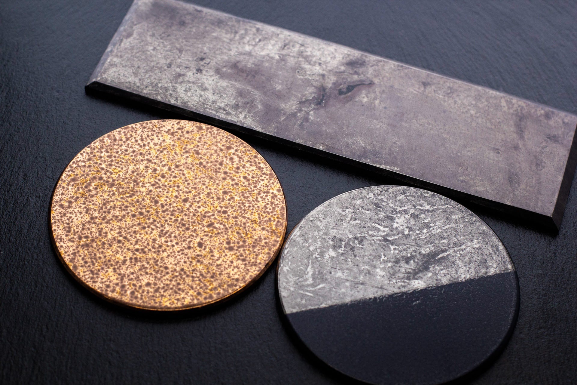 自然素材である金属は、種類によっては酸化反応などで変色が起こるものがあり、そうした変色を意図的に作り出したものが木陰、夜空のカラーとなります。