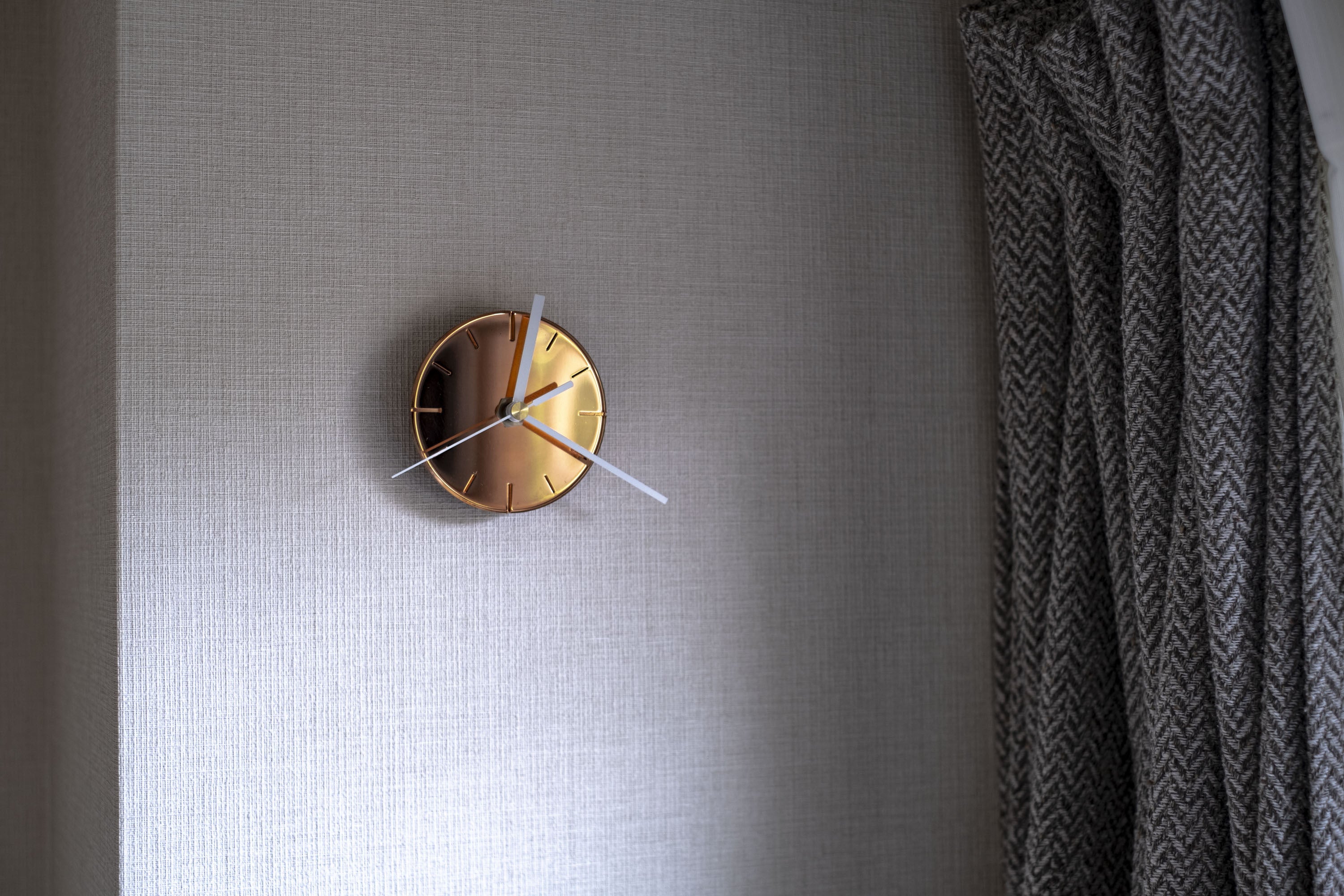 少しくすんだ金属仕上げの時計は、奥行きのある風合いで