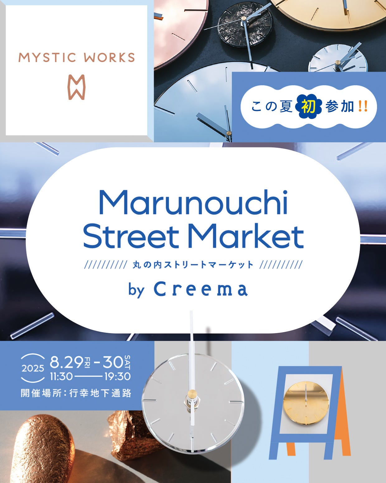 こんばんはMYSTIC WORKSです。現在実施中のクラウドファンディングは残り10日ほどとなりました。現在の支援率はおかげさまで500%を超えております!さらなるストレッチゴールとして150万円を目指しておりますので、引き続き応援いただけると嬉しいです!タイトルのとおり、また活動報告の中でもたびたび告知しておりますが、今月末の金曜日と土曜日、東京・丸の内の地下通路で開催されるイベントに参加します!クラファンでもリターンとして出している「ひかりを楽しむ掛け時計」シリーズを展示予定で、クラウドファンディング最終三日間という特別なタイミングに、実物の質感やひかりの表情をじっくり見られる最後の機会です。またビックサイトでのイベントと異なり、無料で誰でも入れるスペースでの出店なので、ご支援を検討してくださっている方や、一目見てみたいという方は是非お越しください!さらに、昨年のクラファンで人気が高かった「月光/ブルー」のカラーも会場限定で販売します!オンラインでは現在販売休止中のアイテムですので、このチャンスをぜひお見逃しなく。現在時計のディスプレイ台を作るなど、どのような展示方法にするかを模索しているところです!より世界観が伝わるような構成を検討しておりますので、是非ともご来場をお待ちしております!--------------------【イベント概要】Marunouchi Street Market by CreemaブースNo:A-9日程2025年8月29日(金)・30日(土)時間11:30~19:30場所東京丸の内 行幸地下通路アクセス方法JR東京駅 ⇒ 丸の内地下中央口より地下道で直結丸の内線東京駅⇒地下道より直結千代田線二重橋前駅⇒7番出口より地下通路に直結イベント詳細はこちら↓https://event.lp.creema.jp/event/marunouchi2025