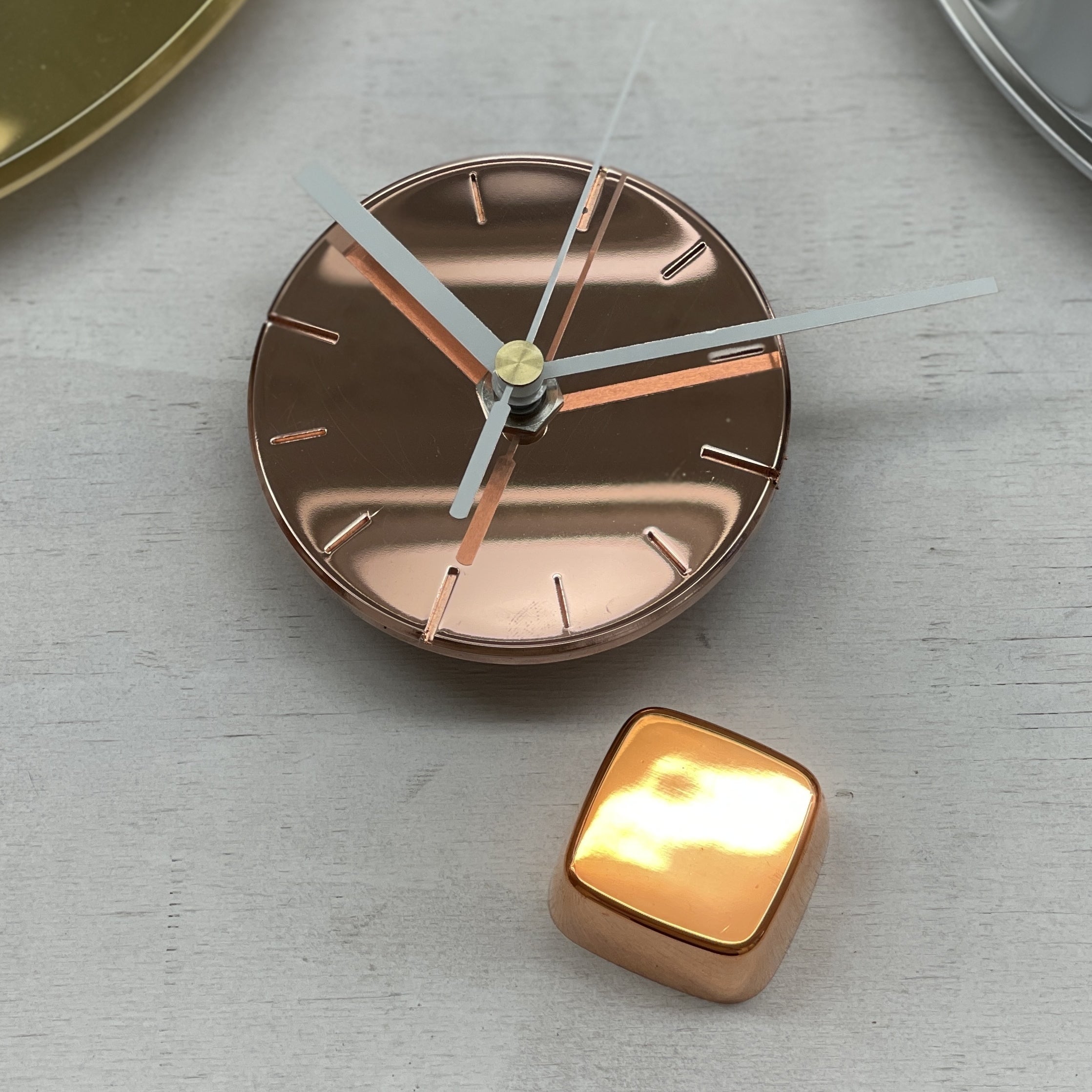こんにちは。プロジェクトの公開より一週間がすぎました。おかげさまで、現在のプロジェクト達成率は515%!支援総額は150万円を超えました!!多くの支援を賜り感謝申し上げます!ネクストゴールは200万円を目指していますので、引き続き見守っていただけますと、可能であれば本プロジェクトをシェアいただけますと幸いです!さて、現在のお申し込み状況を拝見したところ現在、カラーの一番人気は「朝焼け/コーラルピンク」でした!このカラーは本物の銅の金属を素材表面に成膜している「銅めっき」で仕上げられているため、銅という金属の色がそのまま仕上げのカラーとなっています。銅は経年によって深い色味に変化していくことご特徴の金属で、革製品のような「育てる素材」として楽しむことが可能です。写真は変色前の銅(時計)と変色後の銅(キューブ)の比較写真です。変色前のものはピンク系、変色後のものはオレンジ系の色味となっているのが見ていただけると思います。オレンジよりも変化していくと茶系の暗い色味になっていきます。湿度の高い場所に設置したり、頻繁に手で触れるなどすると色の変化が加速して自分だけの時計に育っていくかもしれません。MYSTIC WORKSではそうした金属の特性を楽しんでいただきたいという思いから、変色を止める処理は行っておりません。とはいえ、銅そのままでは製造段階でも変色が起こっていまい、お客様にものが届く前に色が変化してしまうので、蜜蝋によって簡易的な保護を行っています。そのため銅の無垢な状態よりは変化が緩やかになると思われます。最後に「朝焼け」というカラーネームは日の出と共に刻一刻と変化し、やがて色が深まっていく空の表情と、月日の流れとともに色が変化する銅の特性とを重ね合わせ、前向きな変化や成長といった思いを込めて名付けられています。このように経年によって変化する「朝焼け」は、一番長期間飾りがいのあるカラーかもしれません。とはいえどのカラーもおすすめできる仕上がりとなっていますので、是非検討の参考にいただければと思います!