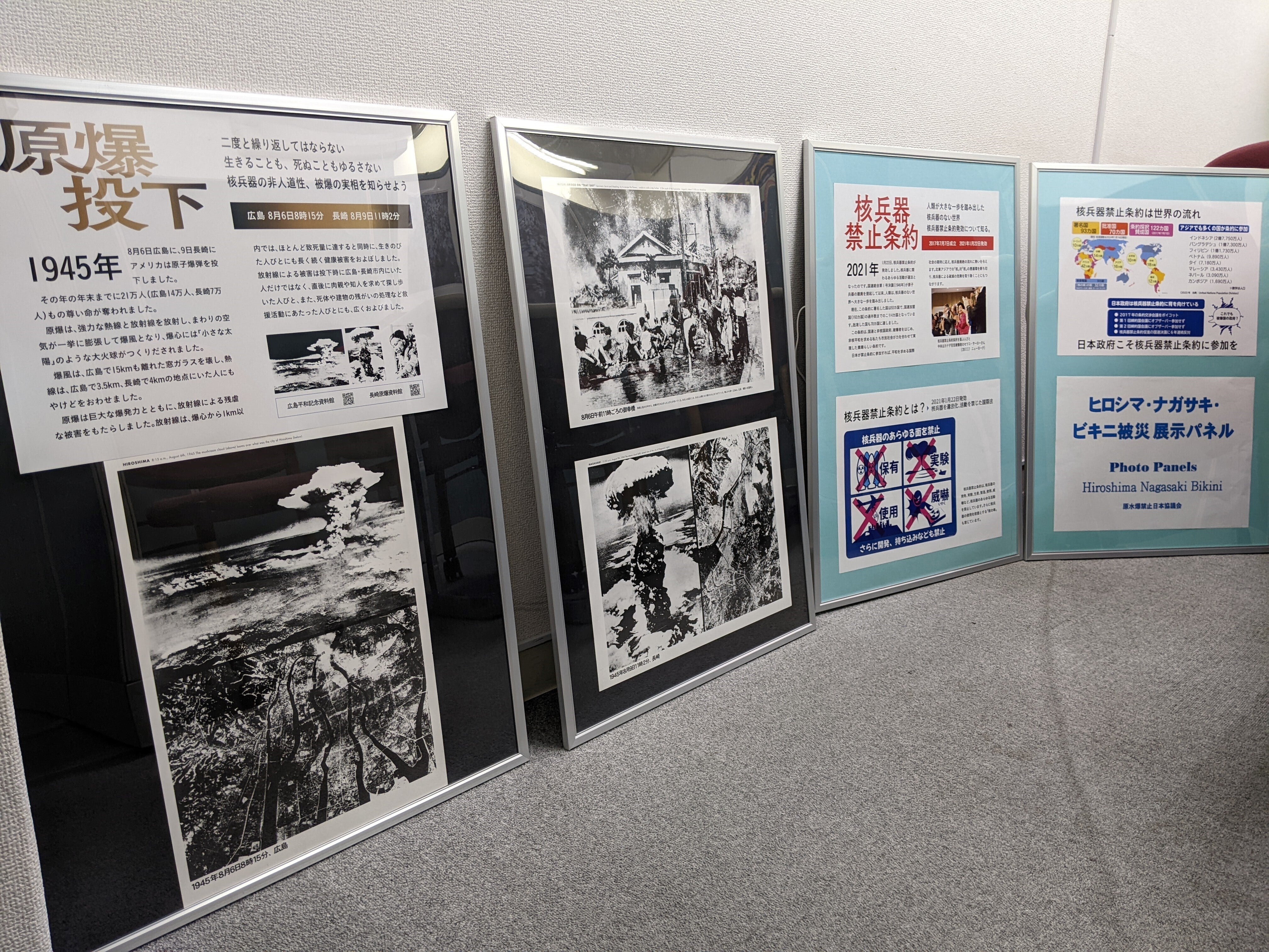 本日、原水爆禁止日本協議会の「ヒロシマ・ナガサキ・ビキニ被災展示パネル」の準備を行いました。
