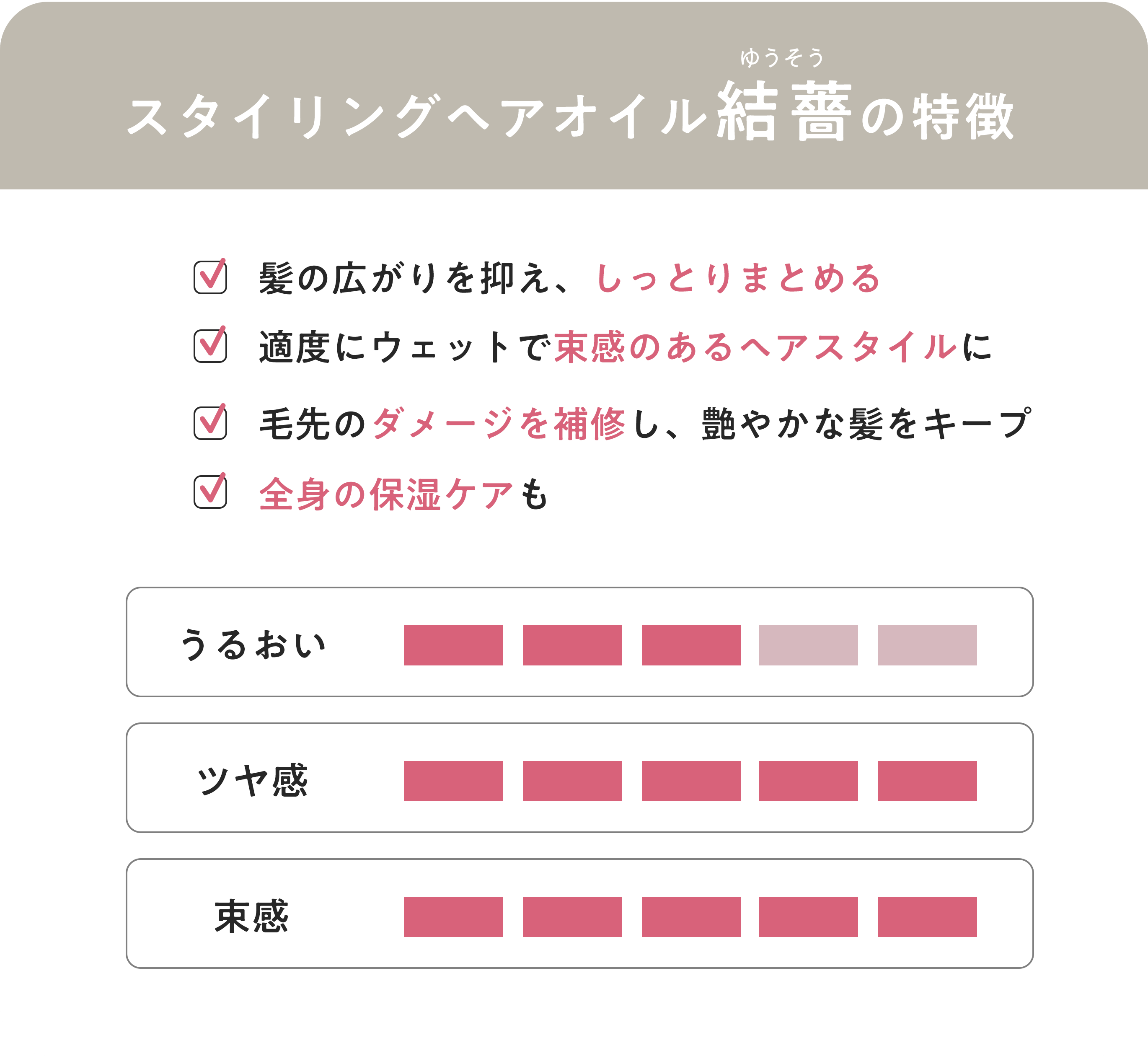 今回、髪の広がりを抑え、しっとりまとめる、適度にウェットで束感のあるヘアスタイルをめざしたヘアオイルを開発しました。