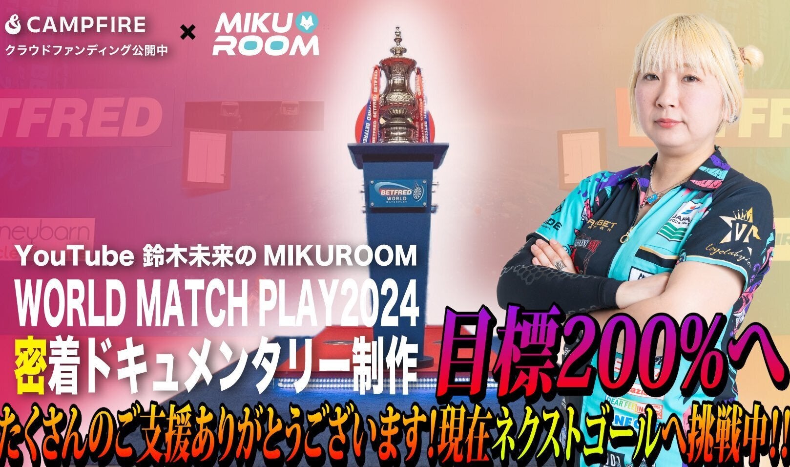 目標金額を超え、新規で追加リターンは増えませんか?と言うお声をたくさんの方から頂いております。それを受け、今回ネクストゴールを設けることとなりました!クラウドファンディング終了までに達成率200%となりましたら、MIKUROOM 初となるYouTube LiveWORLD MATCHPLAY2024 お疲れ様生放送!を行います!※日時など詳細は未定※新たなネクストゴールに合わせまして、2種類のリターンを追加いたします。ここでしか手に入らない幻のライブカードが購入特典としてついてくるリターンもございますので、是非一度チェックしてみてください!▼追加リターン① ¥5,000・MIKUROOM限定 アクリル&DARTSLIVE CARDスタンド・鈴木未来のMIKUROOM World Matchplay編 エンドクレジットへお名前を記載 購入特典:非売品 「MIKUROOM DOOR」DARTSLIVE CARD▼追加リターン② 限定数:30 ¥15,000・MIKUROOM限定 アクリル&DARTSLIVE CARDスタンド・クラファン限定 World Matchplayタンブラー・鈴木未来のMIKUROOM World Matchplay編 エンドクレジットへお名前を記載 購入特典:非売品クラファン限定 シリアルナンバー入り クリア加工 MIKUROOM DARTSLIVE CARD(No.001~No.030) ※「No.396」となったカードが一枚だけランダムにございますMIKUROOMディレクター ちゃんみつ