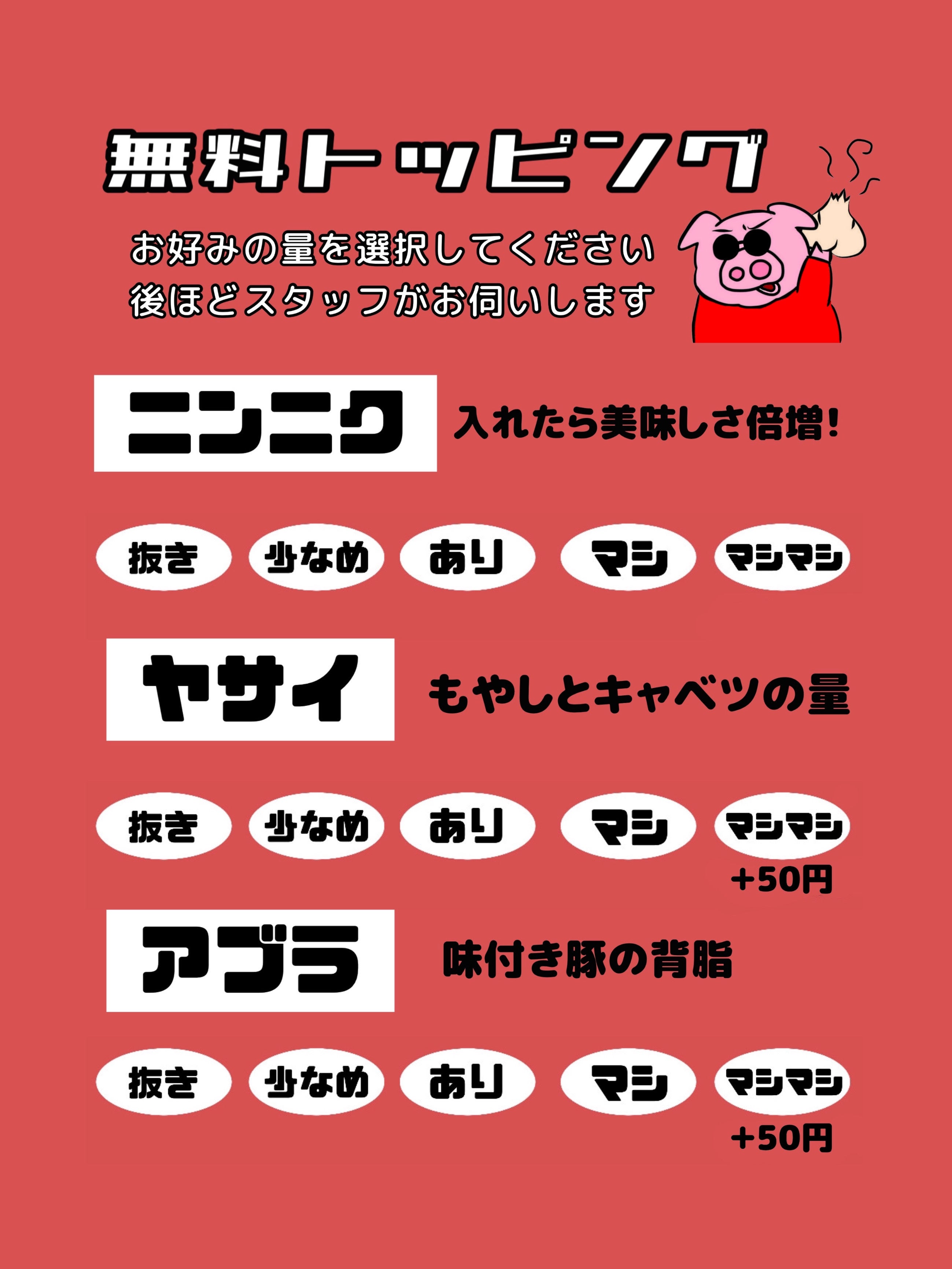 限定麺の提供やトッピングの種類も
