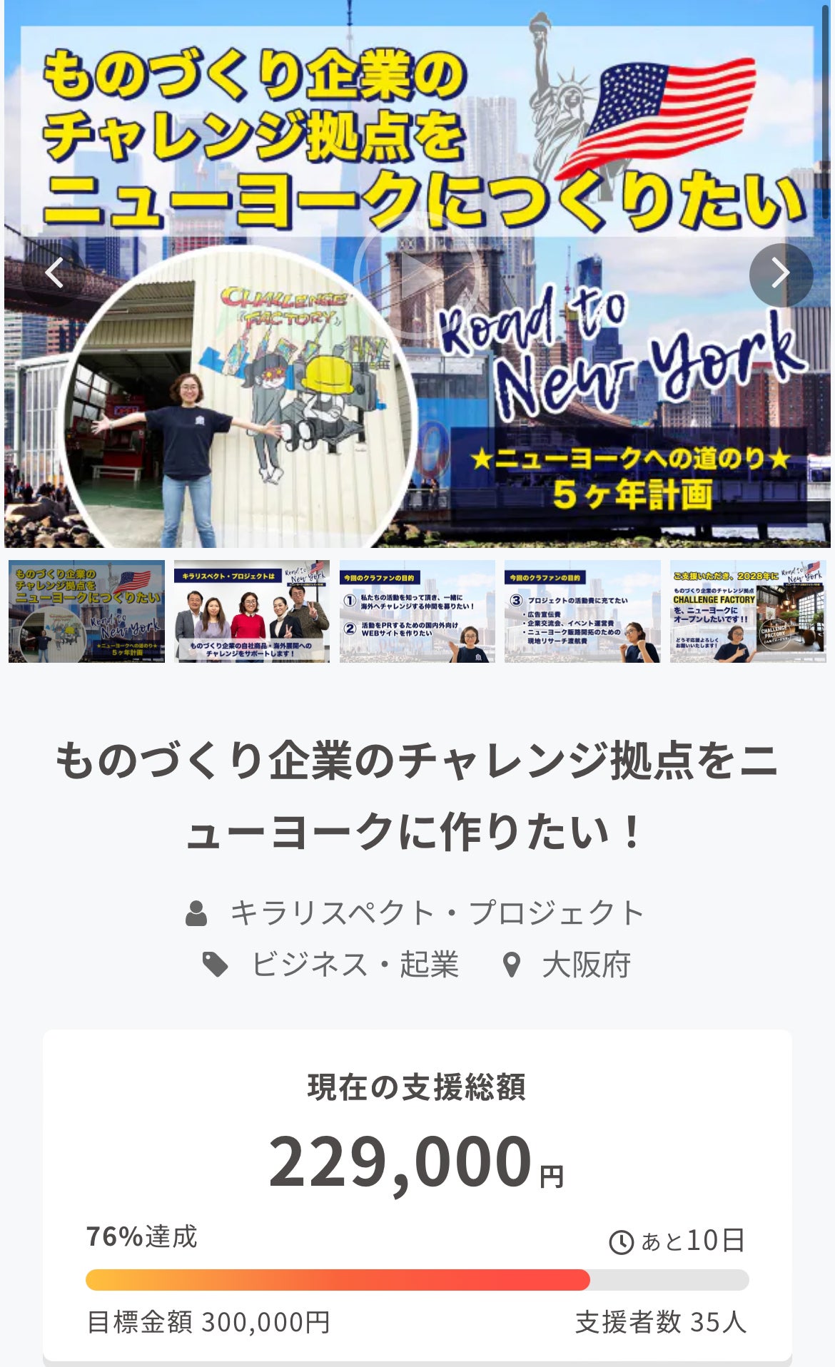 皆様こんにちは!キラリスペクト・プロジェクトの植田由貴子です。クラファンチャレンジ終了まであと8日目、現在達成率78%です。今日もご支援・応援ありがとうございます!さて、今回初めてのクラファンチャレンジですが、自分がチャレンジを始めたことで今までと見える世界が変わってきました。知人・友人でこの同時期にクラファンチャレンジしている人が多い。笑というか、自分が当事者なので目に入ってくるんですよね。赤い車を買おうかな、と考えていると最近赤い車ばかりが目に付く、、っていうのと同じです。今までなら「チャレンジしてるんだ〜」という感じで見ていたのがいざ自分もチャレンジ中となった時に「頑張れ!!」と勝手に仲間意識。笑笑今月に入って、数名の方のご支援させていただきました。中には、開始あっという間に達成された方も。本当にすごいです。単純に商品力だけではなく、準備に告知に相当ご尽力されているのだと思います。自分でチャレンジしたからこそ、苦悩がわかる。だからこそ持てた目線。同じく目標や夢に向かって頑張ってらっしゃる方々にリスペクトとエールを送ります!私たちのチャレンジも、目標金額まであともう少し。ご支援「しようと思いながらまだできていなかった〜」や、今この時点でこのプロジェクトを知って頂けた方はぜひ、ご支援をよろしくお願いいたします。また、ご支援くださった皆様には、引き続き応援拡散いただけますと嬉しいです。