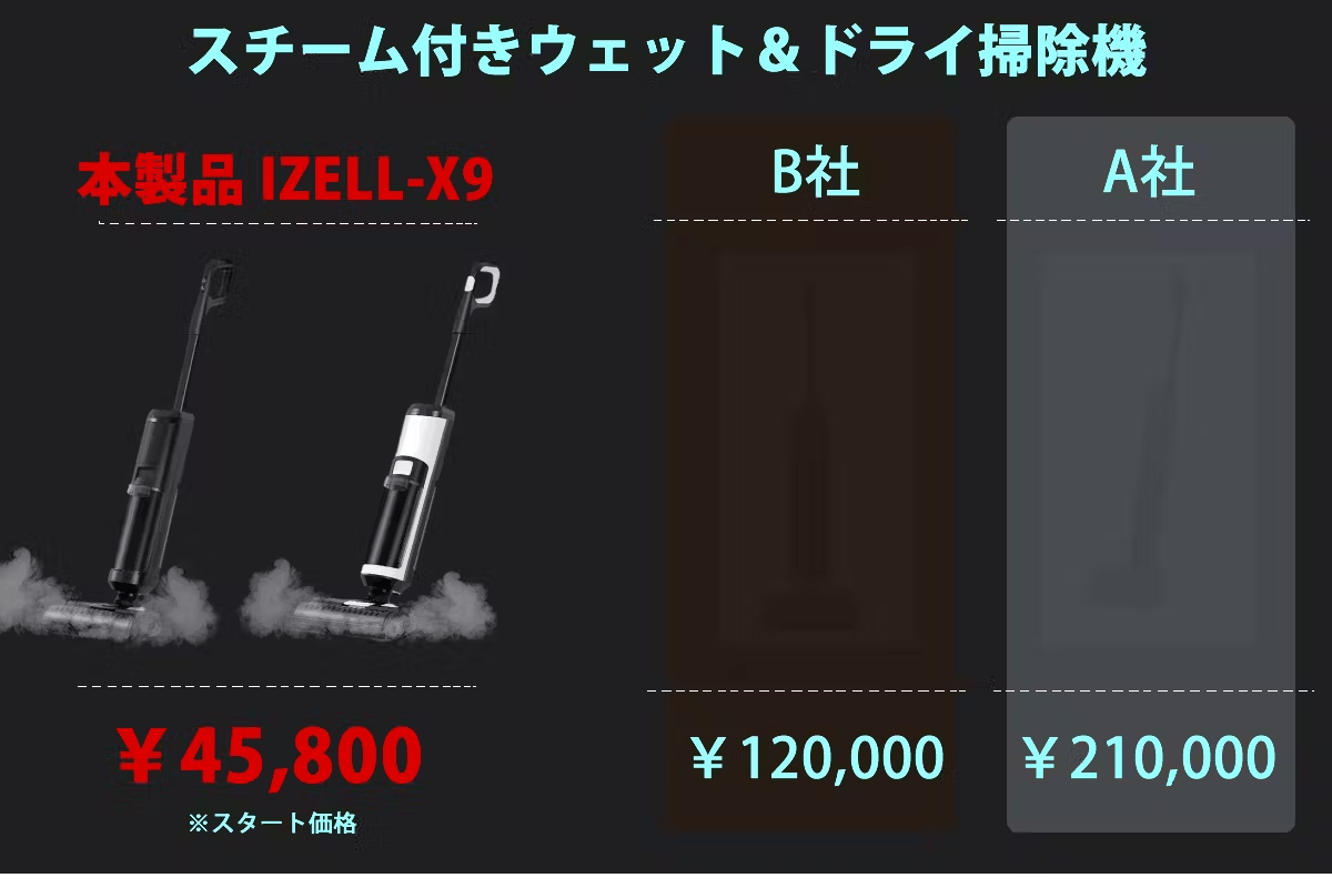 スチーム付きコードレス水拭き掃除機IZELL-X9は、スチーム、水拭き吸引、ドライ吸引が一台で行えます!