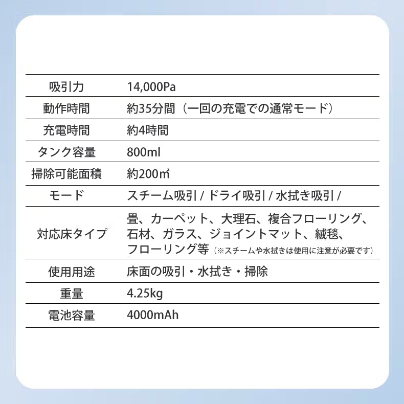 - ・対応床タイプ: 畳、カーペット、大理石、複合フローリング、石材、ガラス、ジョイントマット、絨毯、フローリング等(※スチームや水拭きは床材により使用に注意が必要です)