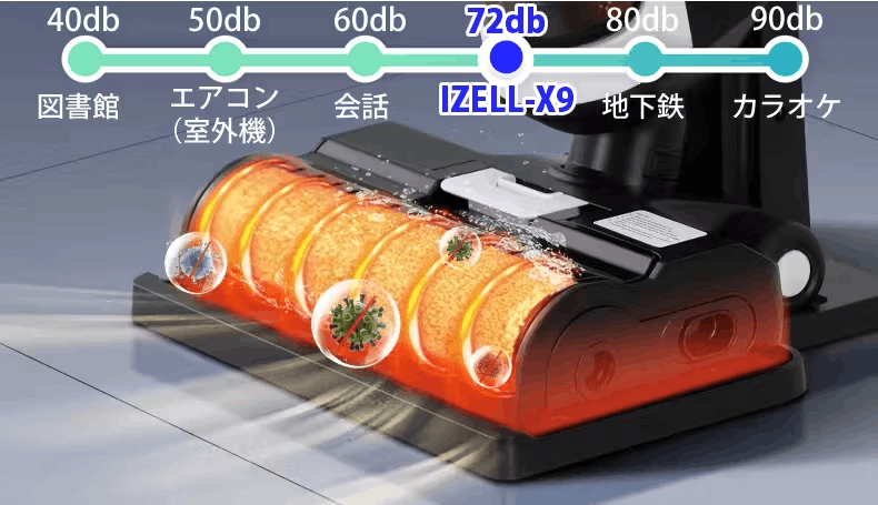 A: IZELL-X9は低騒音設計で、稼働時の音量は約75デシベル以下です。同機能製品と比べると静音設計ですが稼働音は感じます。 -