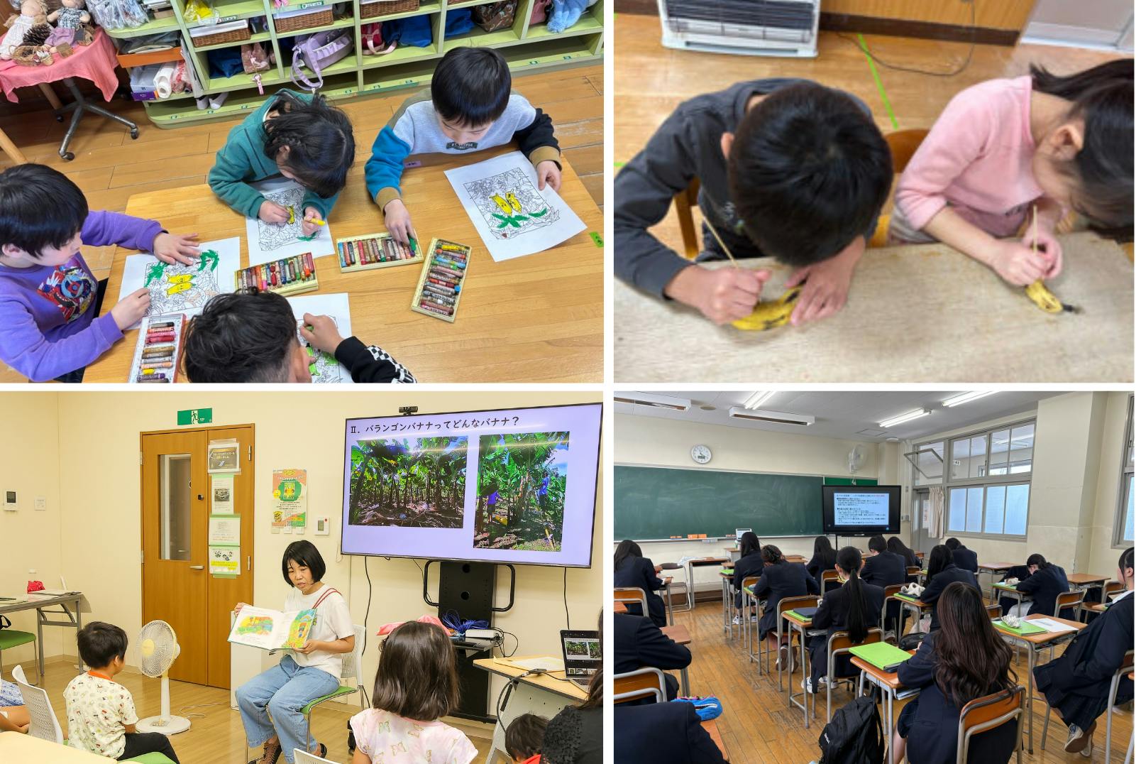 バランゴンバナナ、ぽこぽこバナナプロジェクトを紹介、絵本の読み聞かせをしました。規格外バランゴンバナナやバナナを使ったお菓子を食べたり、バナナアートをしたりしました。