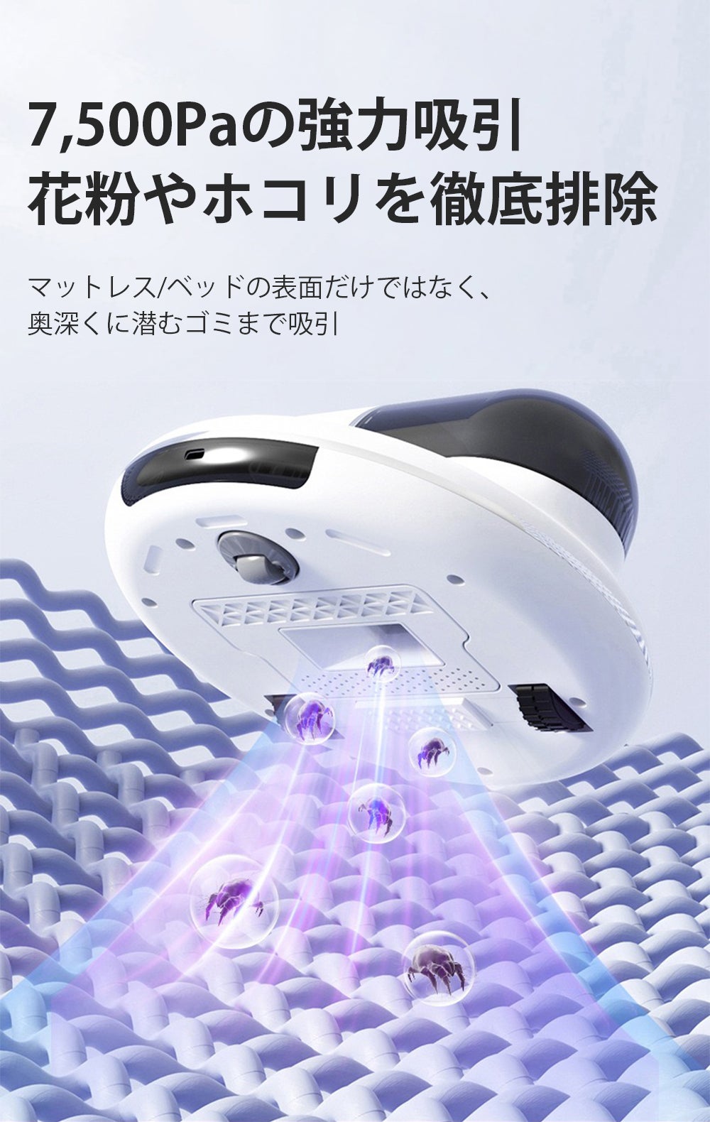 本製品は7,500Paの圧倒的な吸引力を誇り、マットレスや布団表面のゴミや花粉、ペットの毛はもちろん、深層繊維にこべりついたダニの死骸やハウスダストも一瞬で吸い取ります。