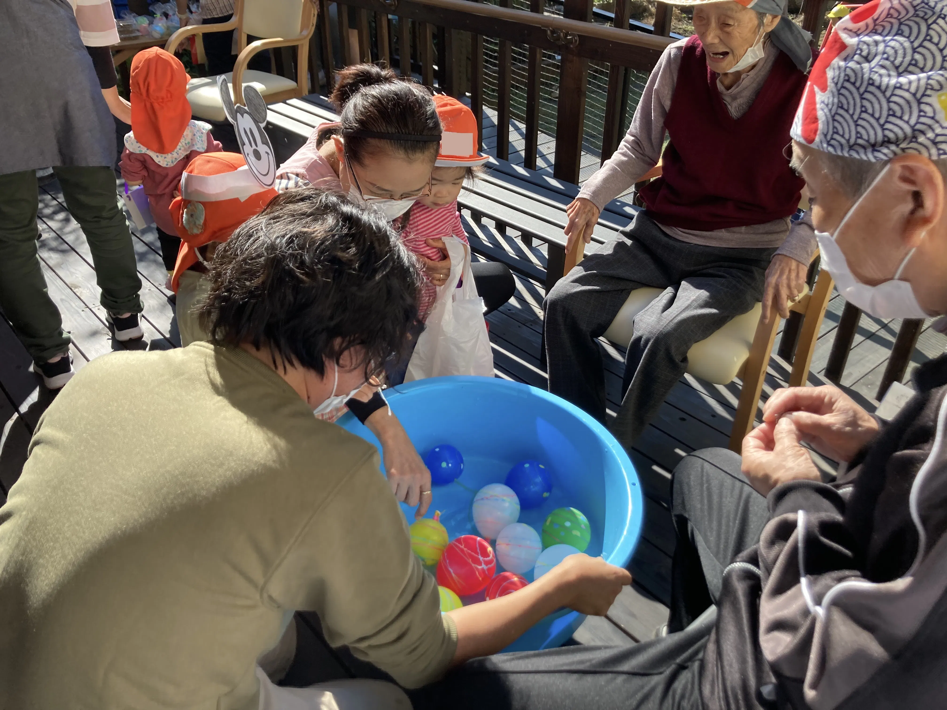 デイサービスで縁日ごっこ。遊びやおもちゃなどは利用者と職員が一緒に用意して、保育園の子ども達をもてなしました。高齢者にとっては役割づくりに、子どもたちにとっては高齢者とともに様々な遊びを経験できます。楽しい時間を共有することで、子どもたちの中には、進んで高齢者に挨拶するようになる子も出るなど、他者への信頼感が育ちます。