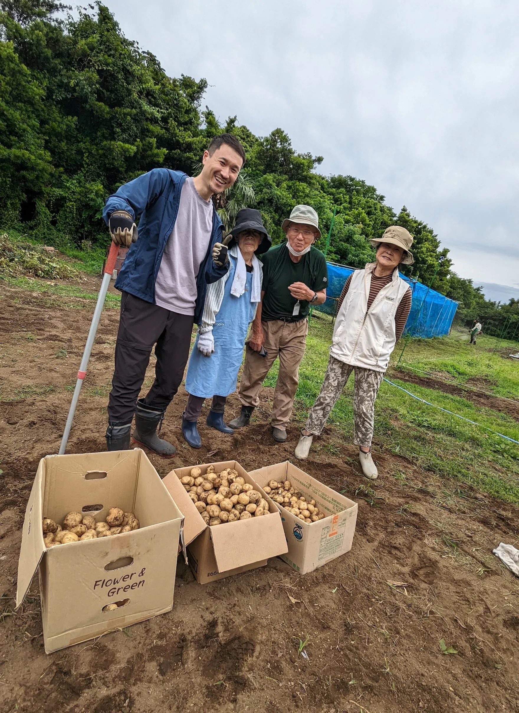 富戸ケアファームでじゃがいもの収穫の様子。私は、静岡県伊東市で生まれ育ち→農学部卒業→青年海外協力隊でマラウイへ→東京でサラリーマン→アフリカの農業開発を行う国際NGO勤務→伊東市で福祉事業、という経歴です。