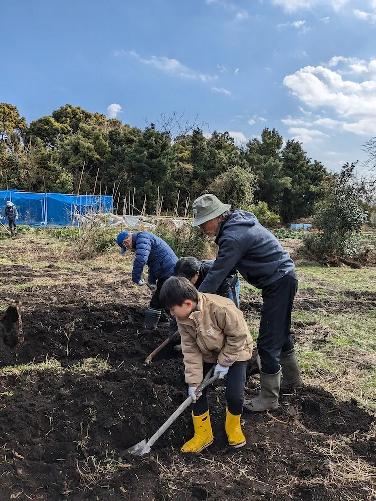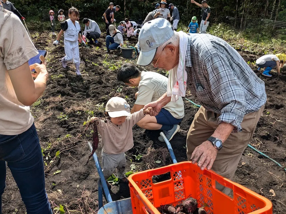 富戸ケアファームでの芋掘りの様子。こうした体験ができるのは、毎週一緒に畑作業してくれる高齢者の方々がいるから。