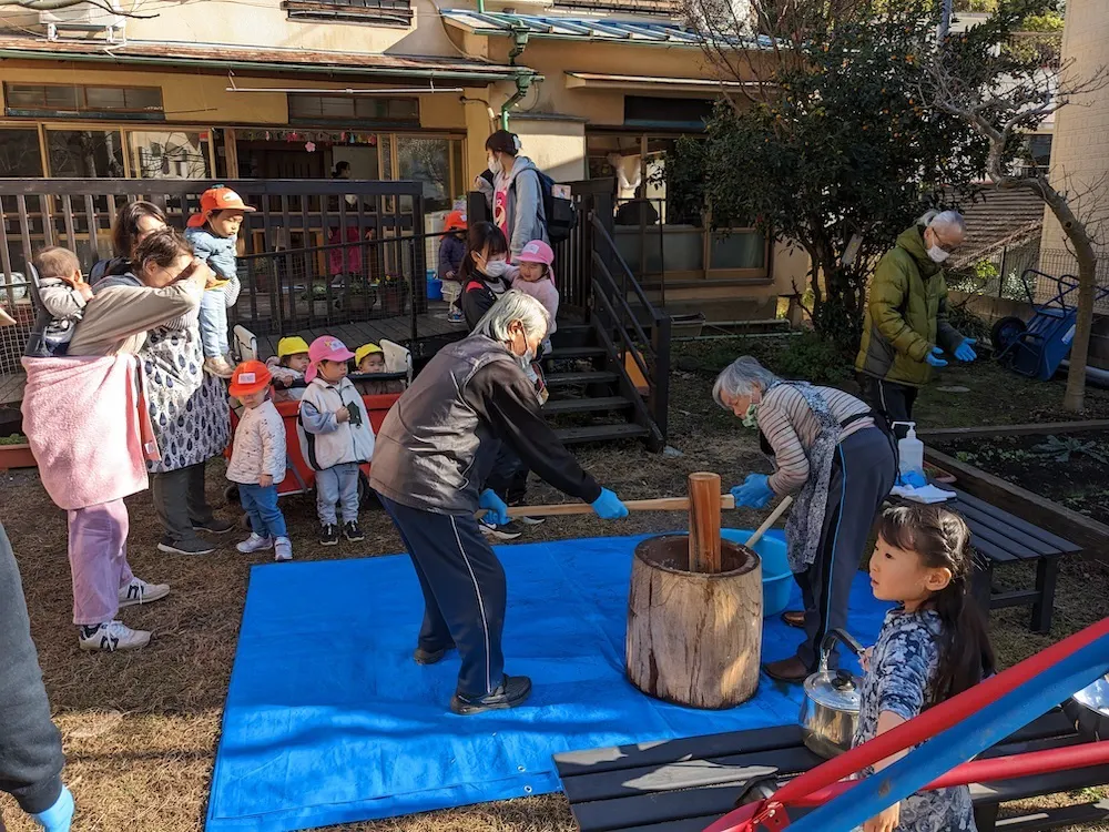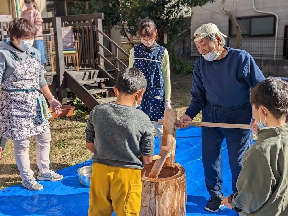 デイサービスで恒例の餅つき大会。デイの高齢者と職員とで準備から餅つき、調理まで行います。保育園の子達や近隣の子どもたちも参加します。