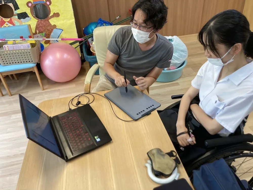 障害福祉サービスとボランティアでの送迎を組み合わせて、身体障害のある方の通学支援。放課後、パソコンを覚えたい本人の希望があり、(パソコンが得意な)作業療法士によるパソコンレクチャーを実施しました。後日、パソコンの購入時にも付き添いました。