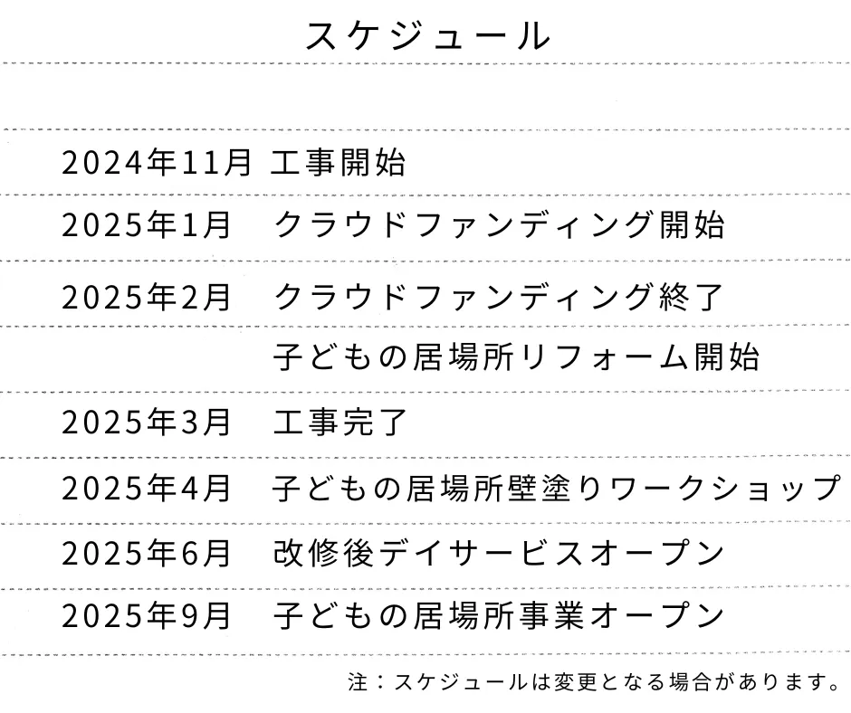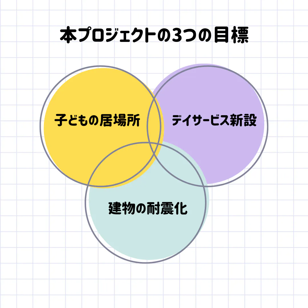 このプロジェクトは、デイサービスの施設を耐震化し、安全性と快適性を向上し、ニーズの高いデイサービスを増設と、不登校の子どもたちの居場所づくりを実現するために立ち上げました。
