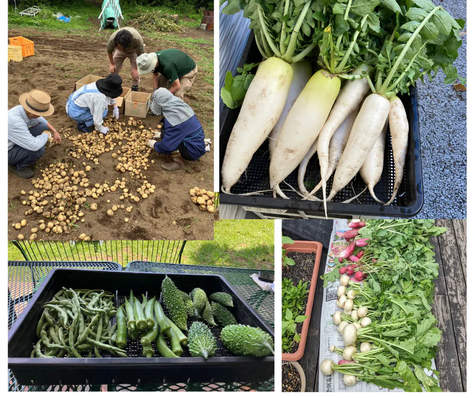 富戸ケアファームで採れた野菜たち。子どもから高齢者まで安心して作業できるよう、農薬を使わずに栽培しています。採れた野菜は、保育園など地域で活用できるよう少しずつ取り組んでいます。