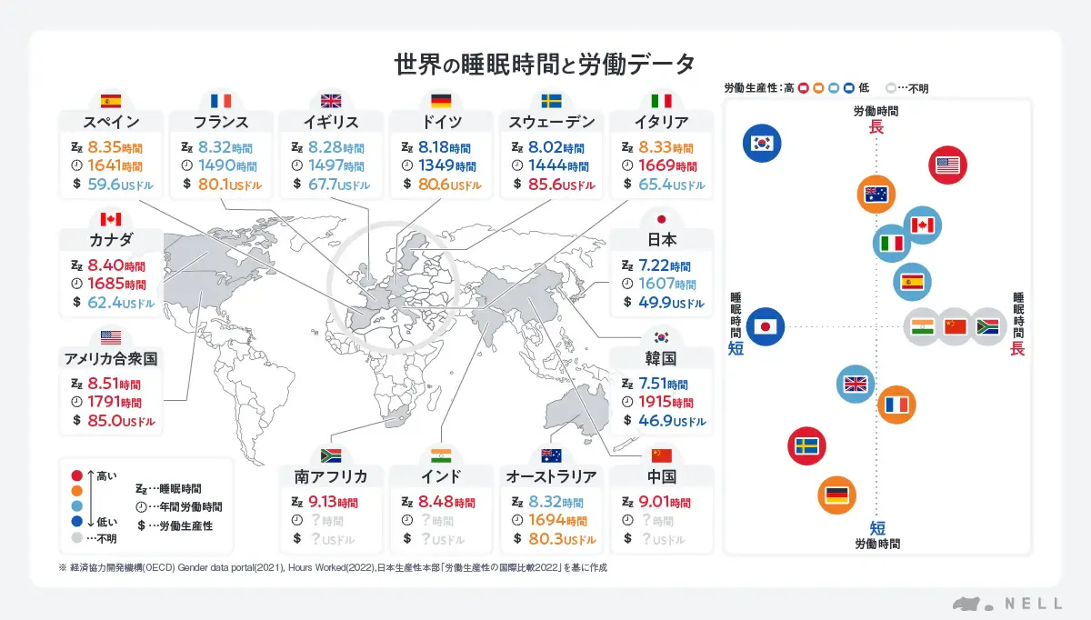 経済協力開発機構(OECD)の2021年版調査※1によると、日本人の平均睡眠時間は7時間22分と、加盟国30カ国のうち最下位を記録しており、更に男性より女性の方が13分短く、これは日本を含む6カ国だけの傾向でした。