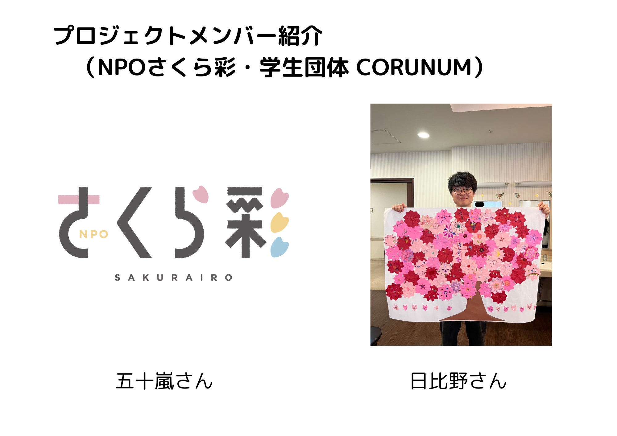 本日は、NPOさくら彩の五十嵐さん、学生団体 CORUNUMの日比野さんです。