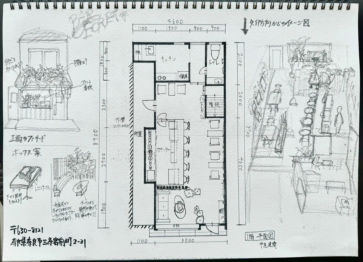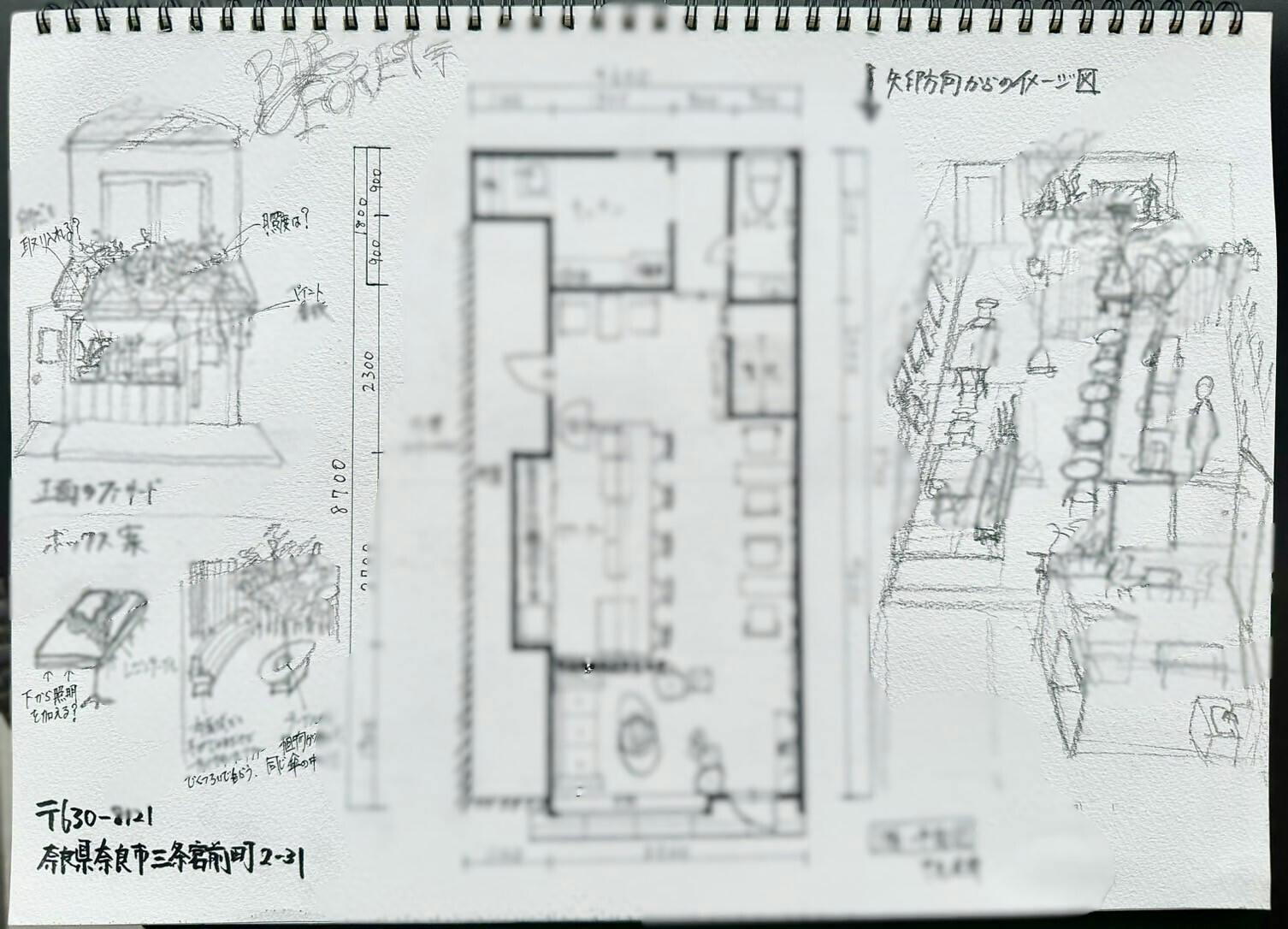 現状としましては、Barを開く物件の内見を行い、必要な物のコスト選定や室内の寸法を測定、実際に僕自身で図面を描き設計を進めています。