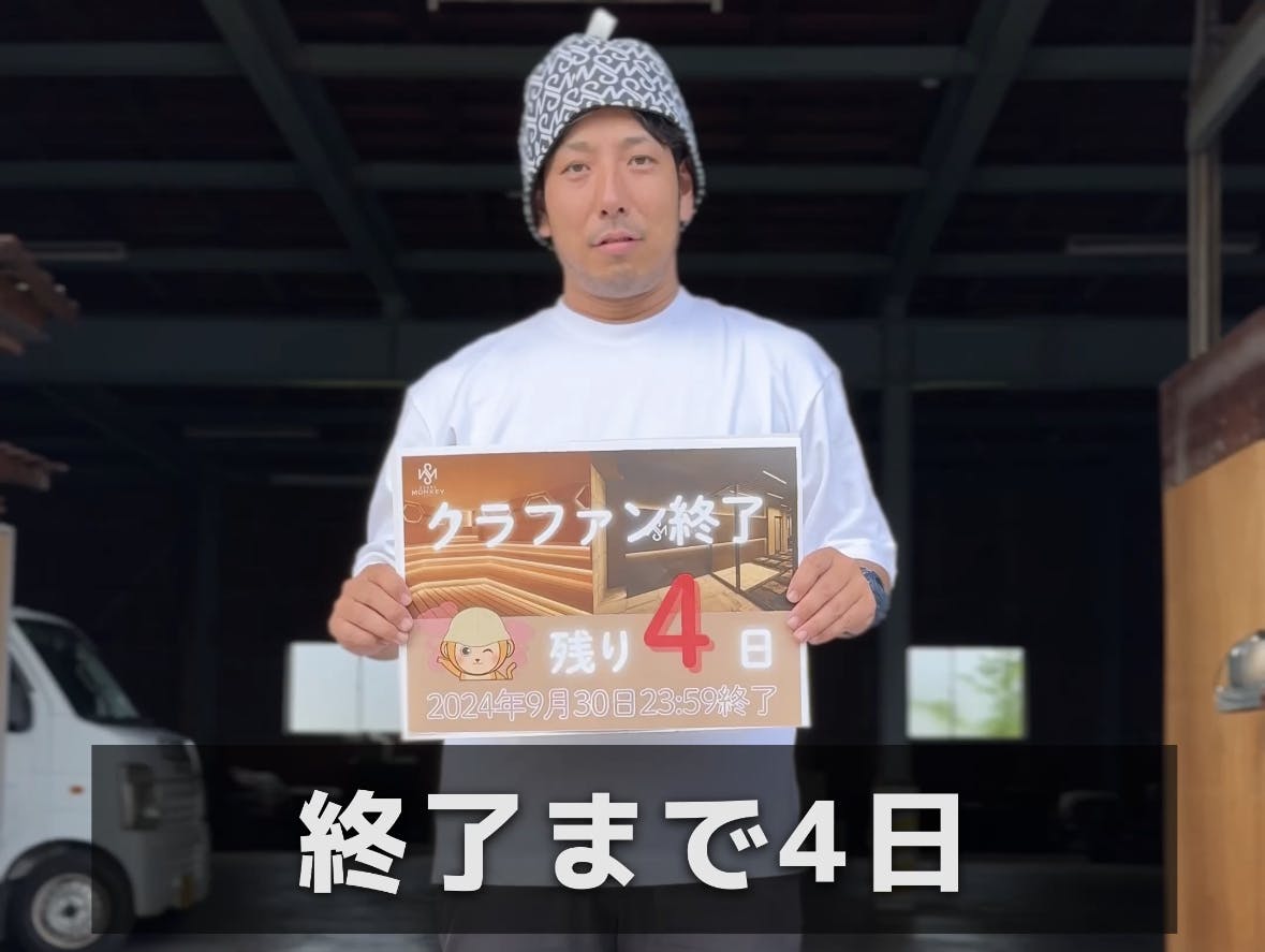 私たちのサウナオープンのためのクラウドファンディングは、残り4日となりました。これまでのご支援で多くの進展がありましたが、目標金額の500万円に到達するためには、皆様のさらなるご協力が必要です。最終目標達成に向けて、ラストスパートをかけるこの時期に、ご友人やご家族にもこのプロジェクトを広めていただき、一緒にサウナ業界を盛り上げていきましょう!