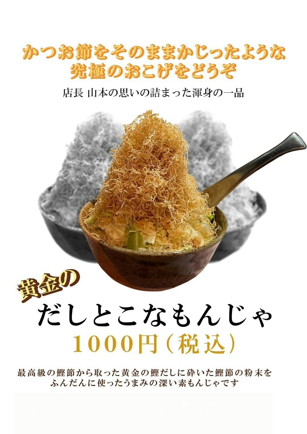 良質な小麦粉と最高の出汁を使った名店の味をベースに 更に4種混合のだしと目の前でスライスする風味豊かなカビ付きのかつお節により、子供の頃に食べたキャベツと切りイカだけの「素もんじゃ」を最高峰に引き上げたメニューで私が受けた同じ衝撃を 老若男女に届けられると思い開発しました。